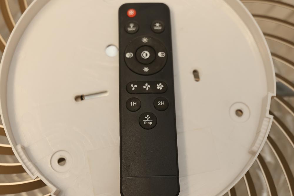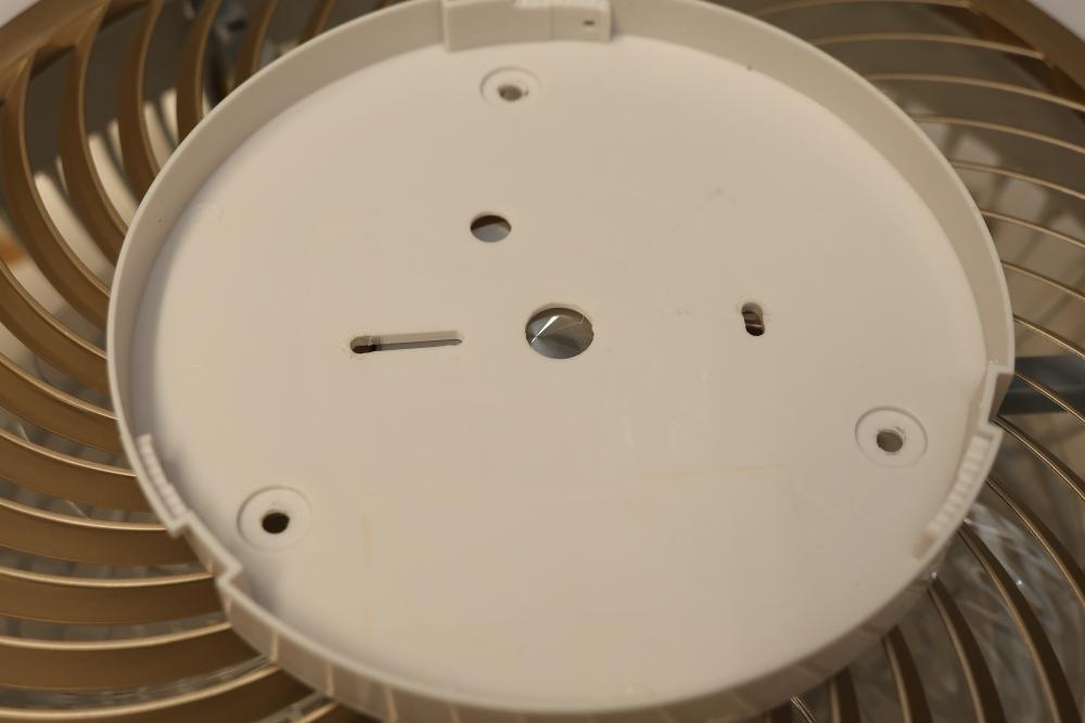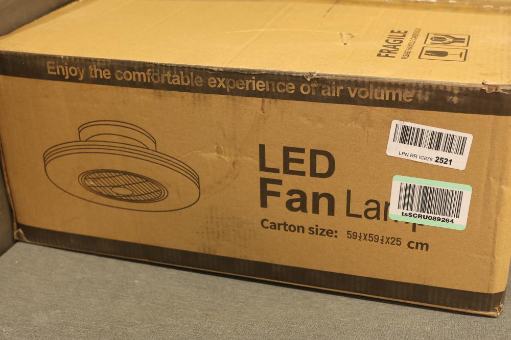 LITTARBY 7888-Golden 22 Inch Enclosed Bladeless Ceiling Fan with LED Lights, Remote, and Golden Trim. Features a bladeless design, integrated LED lighting, golden trim detail, and a remote control for convenience. Pickup only.