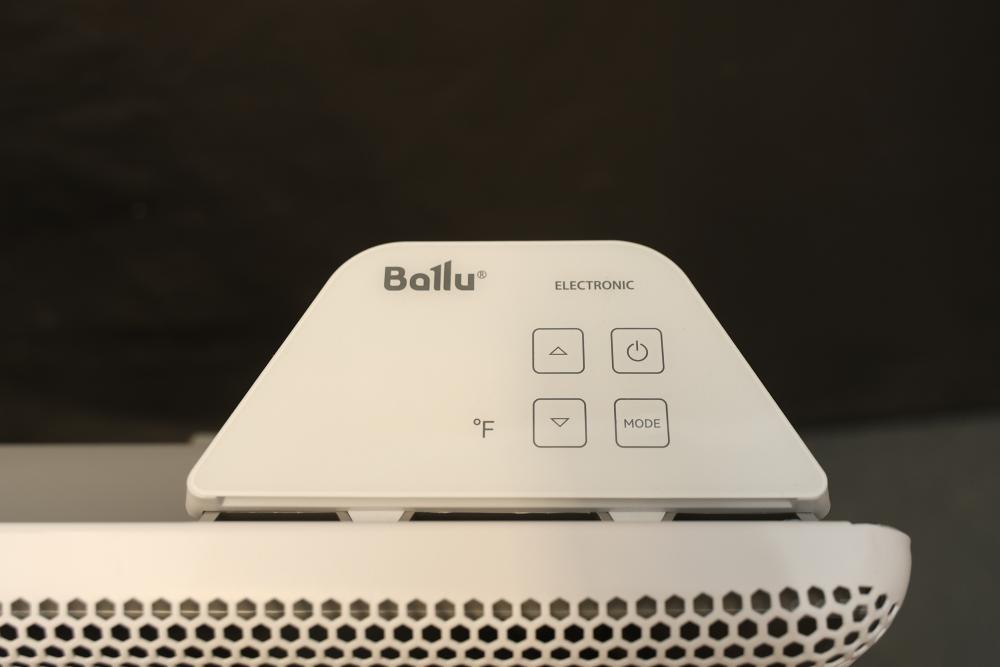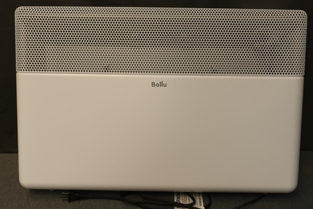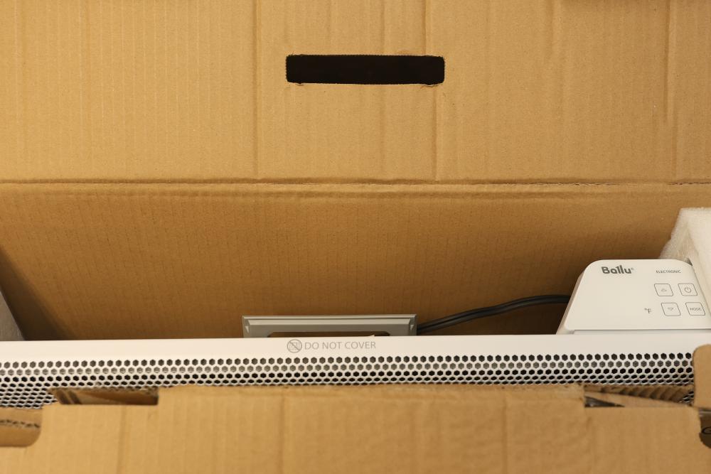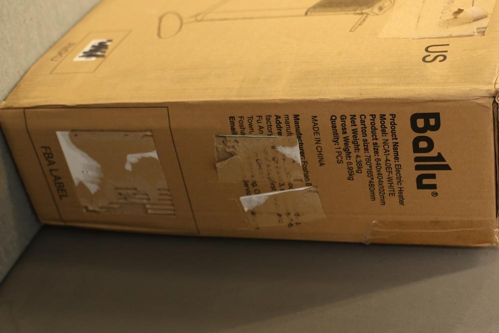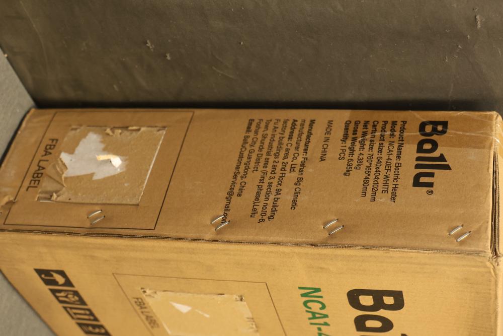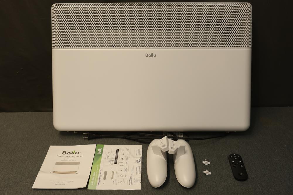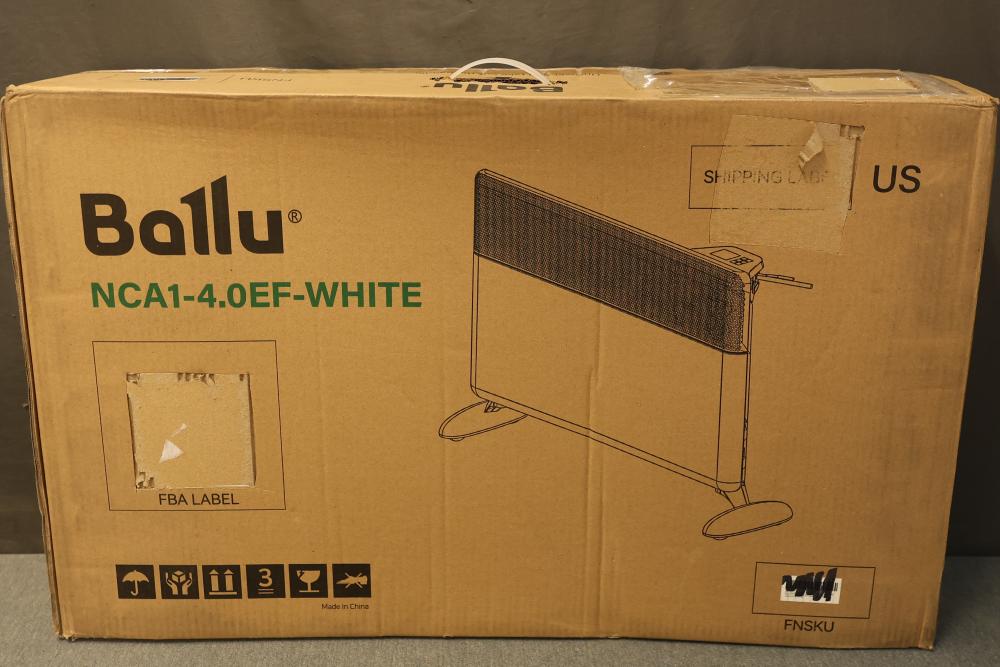 Ballu NCA1-4.0EF-WHITE Electric Heater. The package includes the heater unit, remote control, user manual, and additional hardware, but is missing wall mounting screws and wall screw slots. Product dimensions are 640x404x102 mm and weight is 4.38 kg (gross weight: 6.95 kg). The unit is equipped with functions for electronic control. Pickup only.