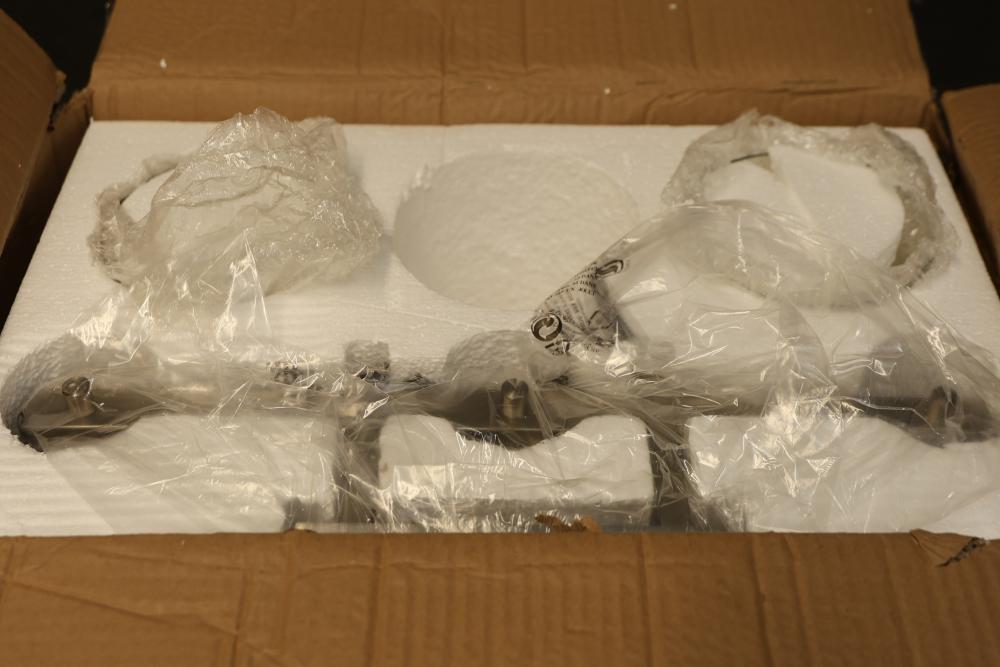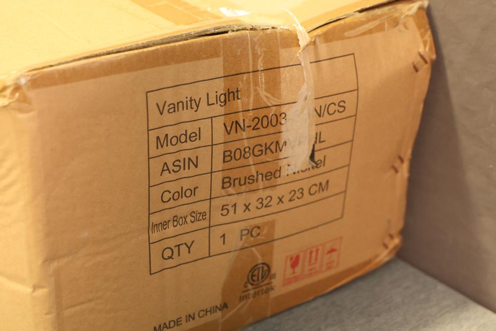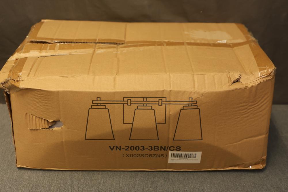Fertel VN-2003-3BN/CS 3-Light Bathroom Vanity Light Fixture with Clear Seeded Glass Shades in Brushed Nickel. Fixture includes brushed nickel finish and clear seeded glass shades. One of the three glass shades is missing, only two shades are included. Pickup only.