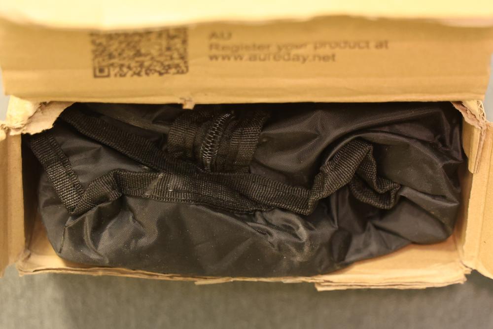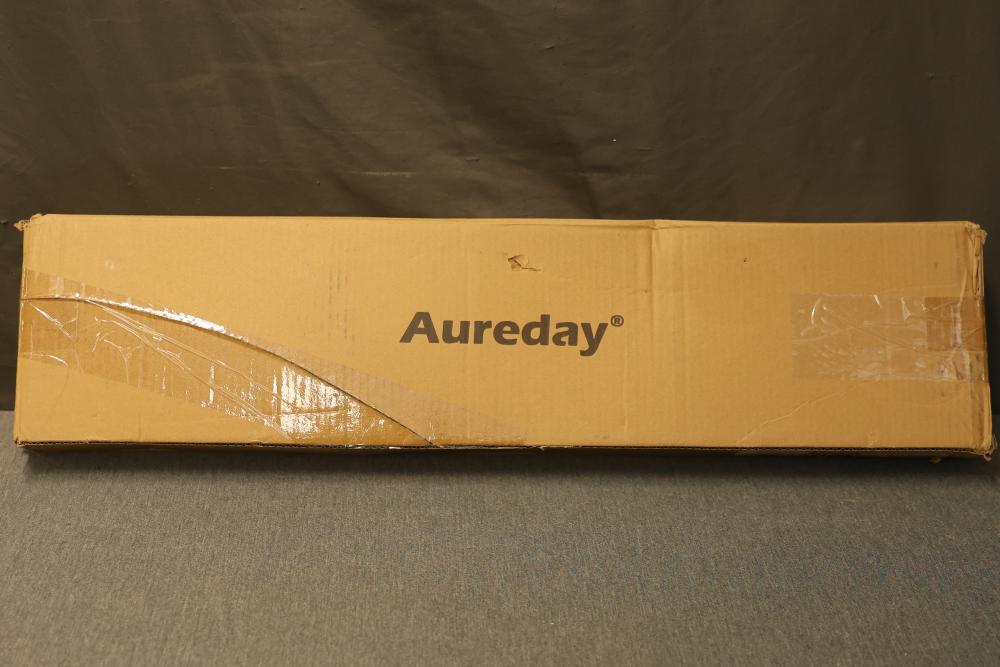 Aureday Backdrop Stand Kit with a maximum height of 7 feet and a maximum width of 10 feet. Includes components for assembly, clamps, and carrying bag. Package displays signs of wear, including dents and scuffing, but contents appear intact. Pickup only.