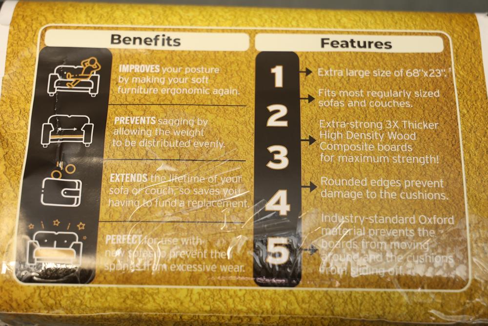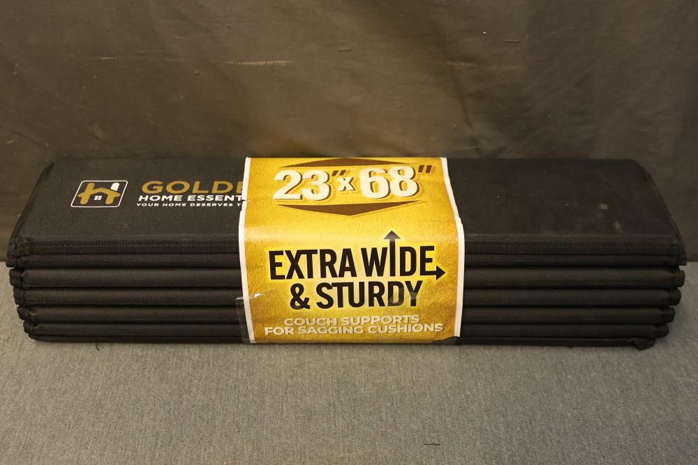 Golden Home Essentials Extra Large Couch Supports, 68x23 Inches. Designed to enhance posture by providing support and preventing sagging in sofas and couches. Made with extra-strong, high-density wood composite boards and an industry-standard Oxford material cover for maximum durability. Features rounded edges to protect cushions from damage. Stock photo displays 68 inches long by 25 inches wide but the actual measurements are 68 inches long by 23 inches wide. Pickup only.