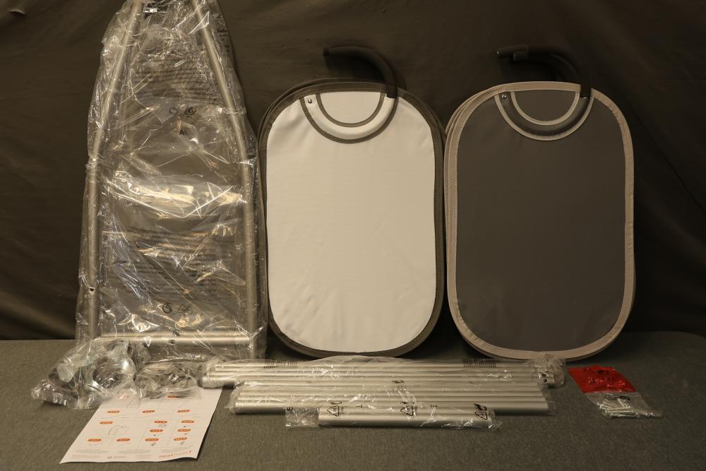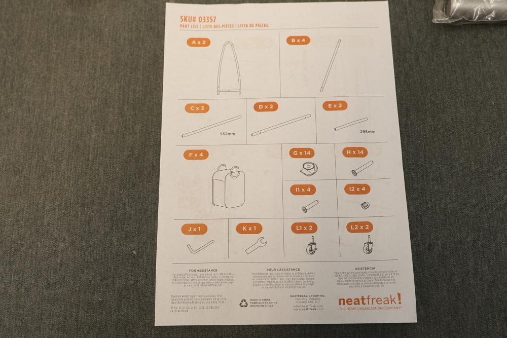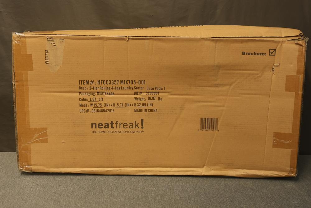 Neatfreak NFC03357-MIX705-001 2-Tier Rolling Vertical Laundry Cart with 4 Tote Hampers. Includes metal frame, rolling casters, and four removable fabric tote hampers for quick and organized sorting of laundry. Assembly is required. New in an opened box with all components and instructions included. Pickup only.
