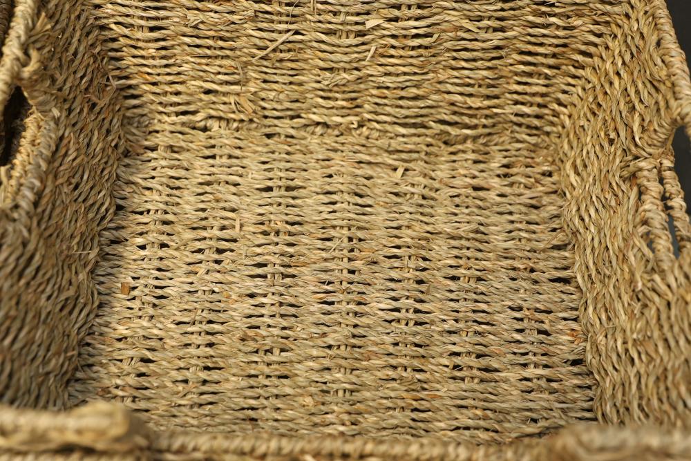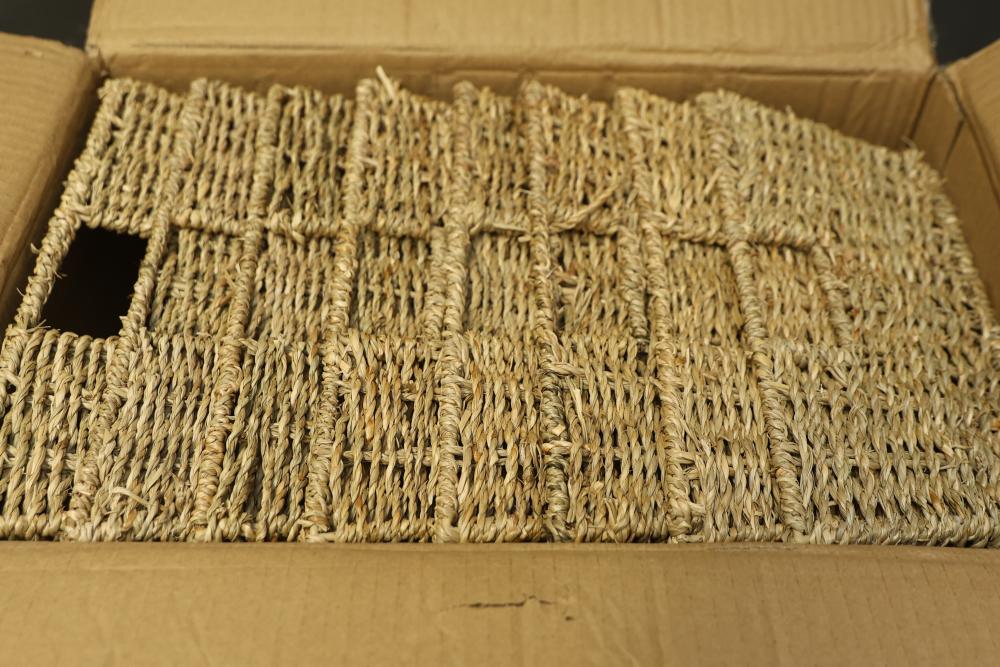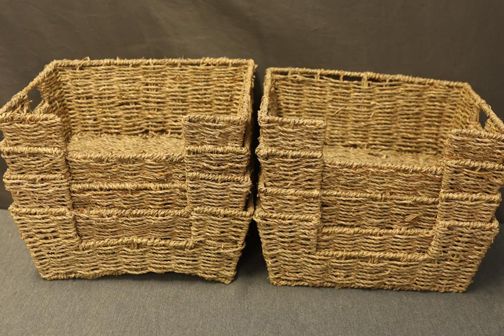 Thyle Seagrass Storage Baskets, Hand Woven with Open Front. Set of 8. Crafted from natural seagrass material, these baskets are handwoven and feature an open front for convenient access. The set includes eight uniform baskets, making them ideal for organized storage. Pickup only.