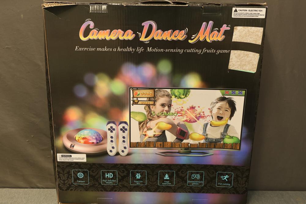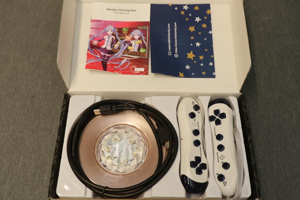 HAPHOM Dance Mat Game for TV with Wrinkle-Free and Non-Slip Design. Features an electronic dance pad suitable for kids and adults. Includes plug-and-play functionality, two wireless controllers, non-slip electronic dance pad, and accessories in original packaging. Compatible for interactive play and exercise. Pickup only.