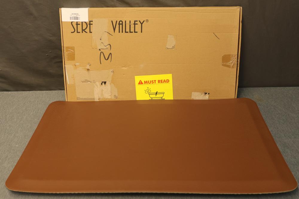 Sky Solutions Anti-Fatigue Leather Kitchen/Stand Desk Floor Mat in Chocolate Brown, measuring 32 inches L x 20 inches W, paired with a Serene Valley NLW2614C Stainless Steel Sink Protector Grid, measuring 26.0625 inches L x 14.0625 inches W. Both items are in original packaging. Pickup only.