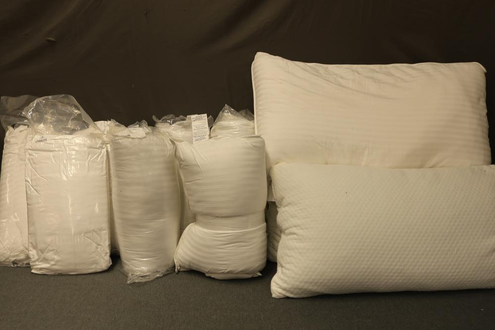 Bedding with 2 Molblly pillows (out of packaging), 5 Beckham Hotel Collection Gel Pillows in King Size (2 out of packaging), and 3 Beckham Hotel Collection Down Alternative Pillows. Pickup only.