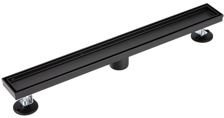Jeconny 24 Inch Linear Shower Drain with Removable Square Hole Panel, Adjustable Feet, and Hair Strainer in Matte Black. The unit includes installation instructions and related hardware. The box exhibits wear with taped areas, but the product is unused. Pickup only.