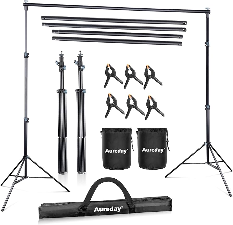 Aureday Backdrop Stand Kit with a maximum height of 7 feet and a maximum width of 10 feet. Includes components for assembly, clamps, and carrying bag. Package displays signs of wear, including dents and scuffing, but contents appear intact. Pickup only.