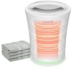 Lagute iSnug Towel Warmer. Designed for efficient towel warming with a compact and lightweight build. Features a LED light indicator for internal temperature and can accommodate small fabrics in addition to towels. Original packaging is included, though the box shows some visible wear and tear. Pickup only.