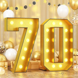 KAINSY 4 Foot Light Up Number '70' Marquee Mosaic Numbers Frame Kit for 70th Birthday Party with Light Bulbs. Includes a pre-cut cardboard frame and light bulbs for assembly. Packaging shows wear with taped repairs and some damage, but contents appear intact. Pickup only.
