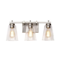 Fertel VN-2003-3BN/CS 3-Light Bathroom Vanity Light Fixture with Clear Seeded Glass Shades in Brushed Nickel. Fixture includes brushed nickel finish and clear seeded glass shades. One of the three glass shades is missing, only two shades are included. Pickup only.