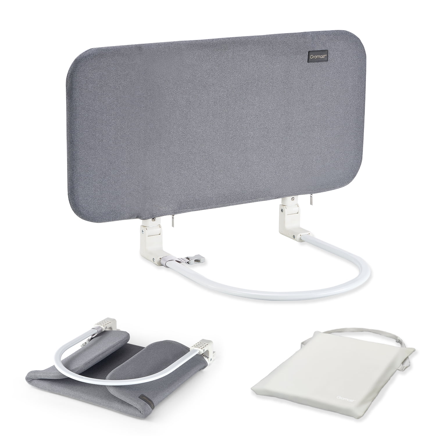 Gromast GT054 32 Inch Portable Bed Rail in Gray, Foldable with Reinforced Anchor Safety. Designed for convenience and safety, this bed rail features a reinforced anchor system to ensure stability and security. It is foldable for easy storage and transport. The set includes the bed rail, necessary accessories, and original packaging. Pickup only.