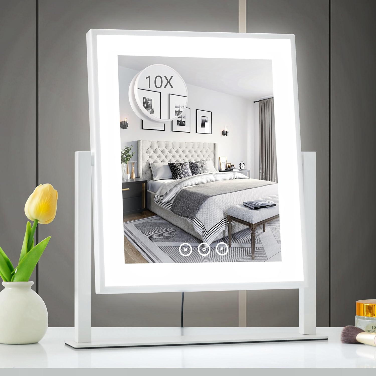 Acoolda LED Hollywood Style Vanity Mirror on Stand With Touch Screen and Lighting Capability. Features a 12-inch-long by 10-inch-wide mirror with integrated LED lighting and touch screen controls. Includes a power adapter, 110V, 60 Hz compatibility, a 10X magnification add-on mirror, and an instruction manual. Pickup only.