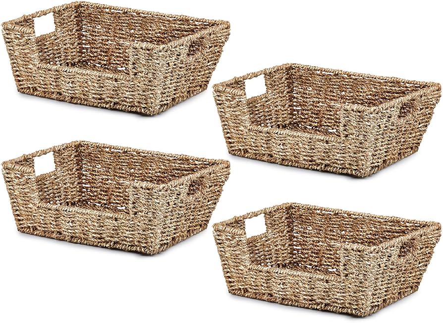 Thyle Seagrass Storage Baskets, Hand Woven with Open Front. Set of 8. Crafted from natural seagrass material, these baskets are handwoven and feature an open front for convenient access. The set includes eight uniform baskets, making them ideal for organized storage. Pickup only.