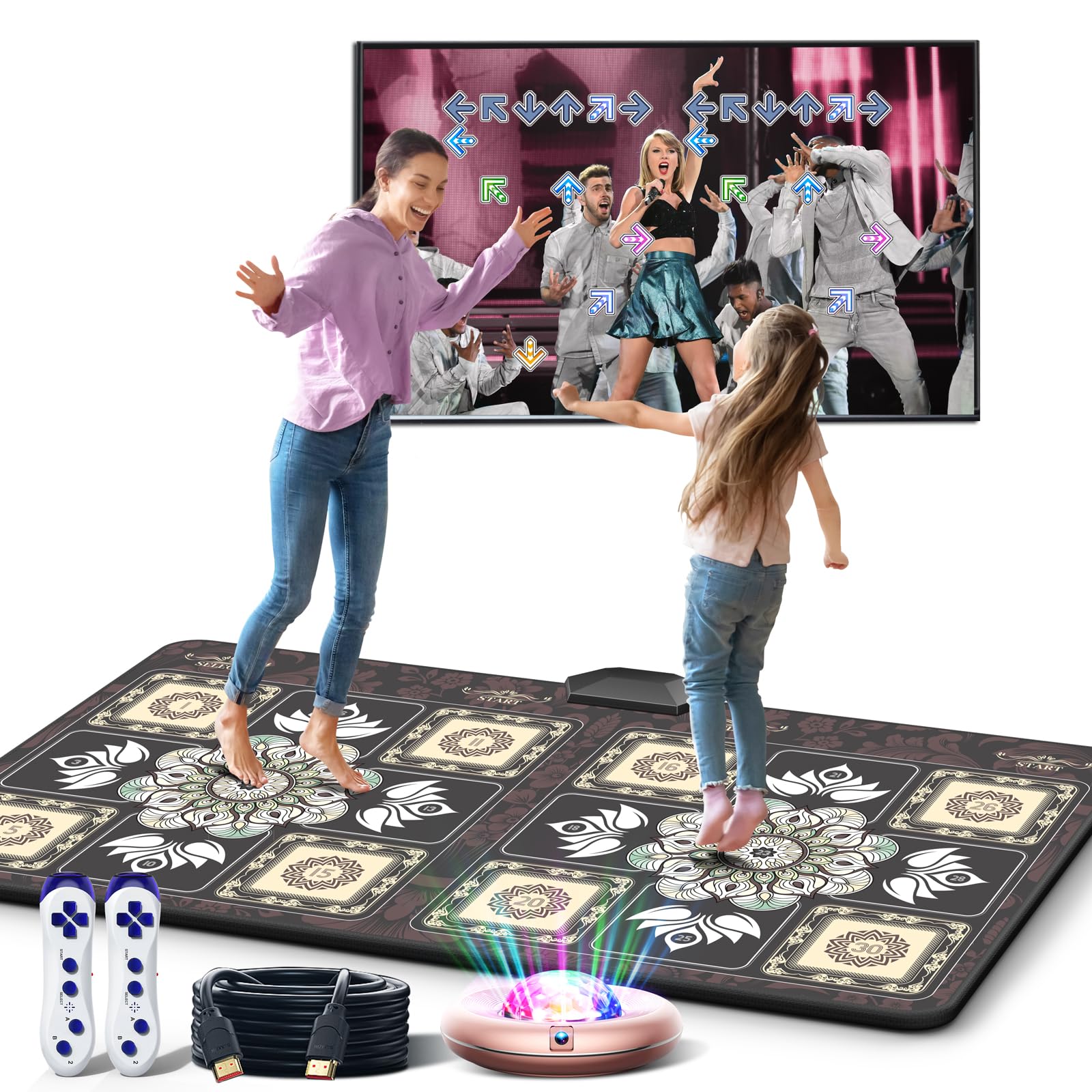 HAPHOM Dance Mat Game for TV with Wrinkle-Free and Non-Slip Design. Features an electronic dance pad suitable for kids and adults. Includes plug-and-play functionality, two wireless controllers, non-slip electronic dance pad, and accessories in original packaging. Compatible for interactive play and exercise. Pickup only.