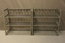Heavy Duty Storage Utility Rack, Set of 2, Measures 16.5 inches L x 16.5 inches W x 8 inches D. Features three-tier shelving and additional integrated hangers on top. Sturdy metal construction for versatile organization and utility storage. Pickup only.
