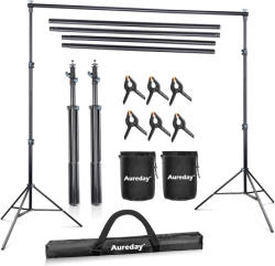 Aureday Backdrop Stand Kit with 7-foot maximum height and 10-foot maximum width. Includes support bars, adjustable stands, clamps, sandbags, and carrying bag. The kit comes in its original box, which shows signs of wear. Pickup only.