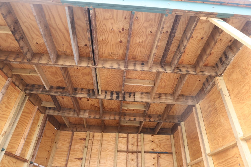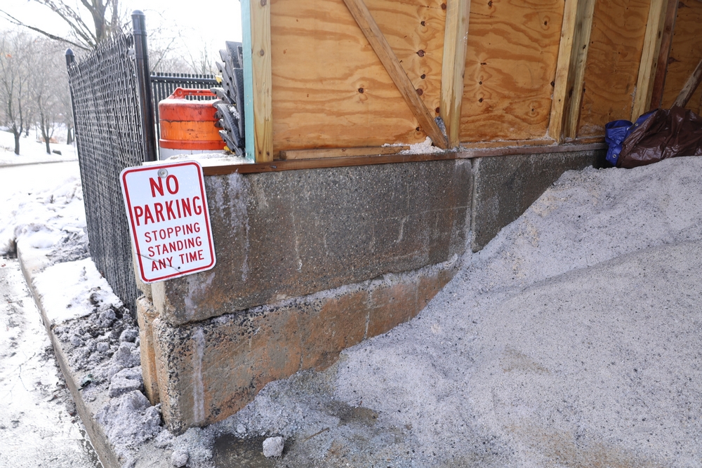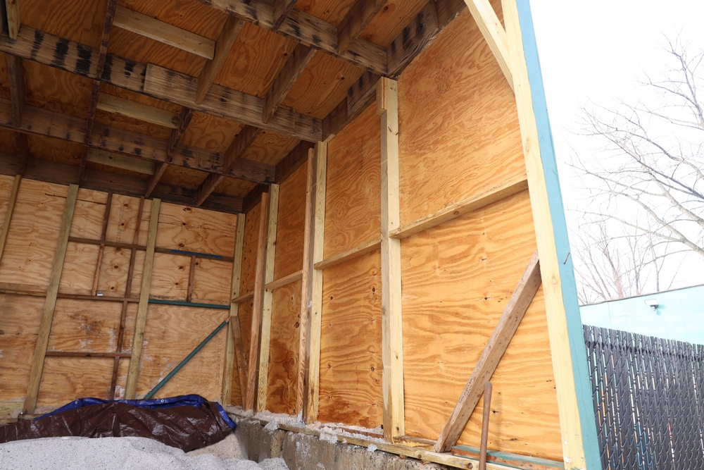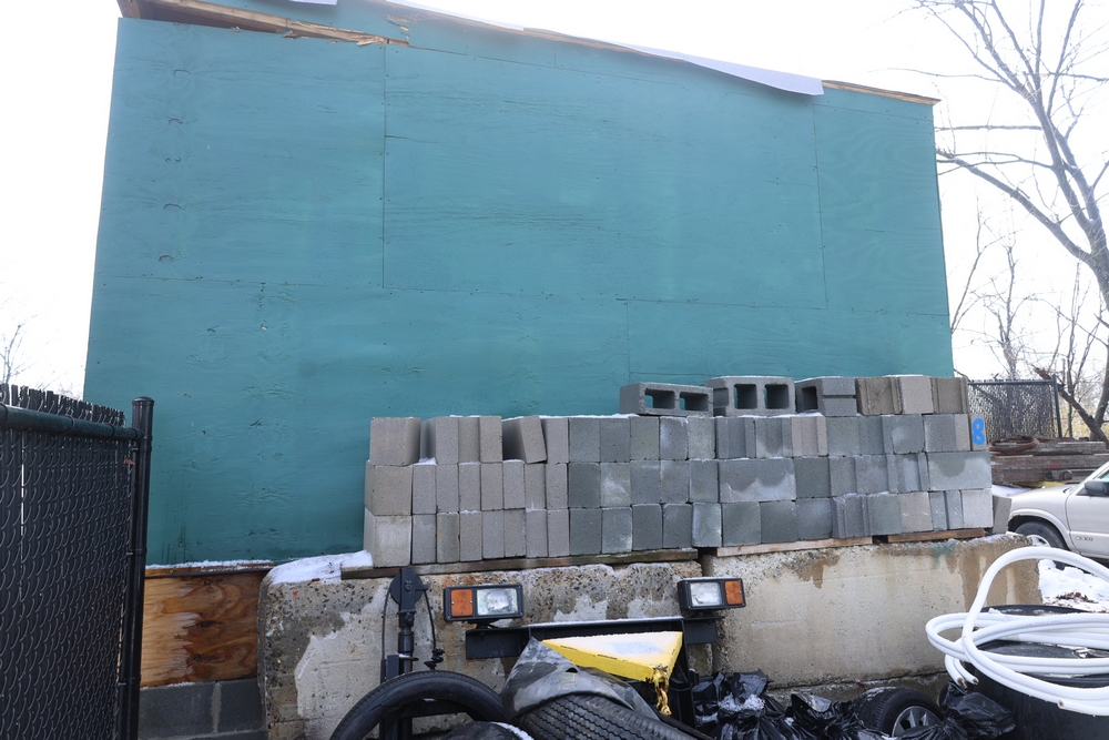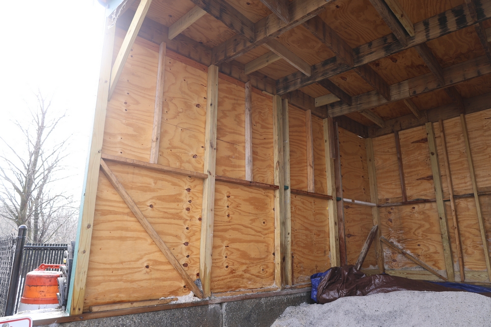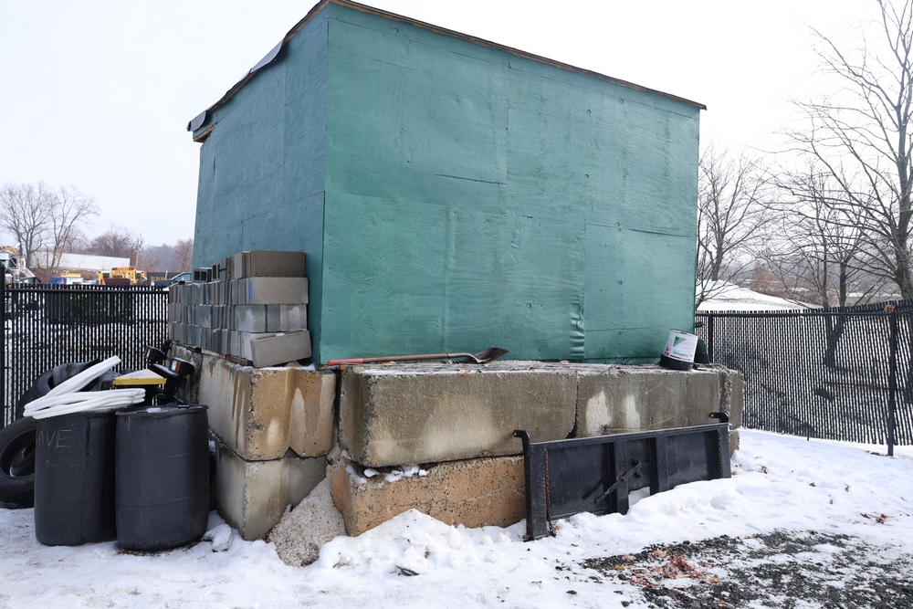 Salt storage shed structure measuring approximately 174 inch x 178 inch, constructed with wood framing and plywood sheathing on precast concrete barrier blocks. Open front design for material loading. Lot includes the wood shed structure and the stacked concrete barrier blocks shown. Seller will disassemble for transport; buyer to call after winning to discuss disassembly.