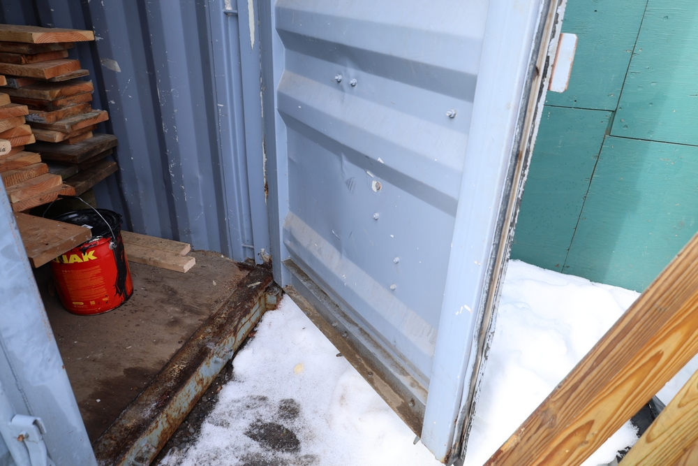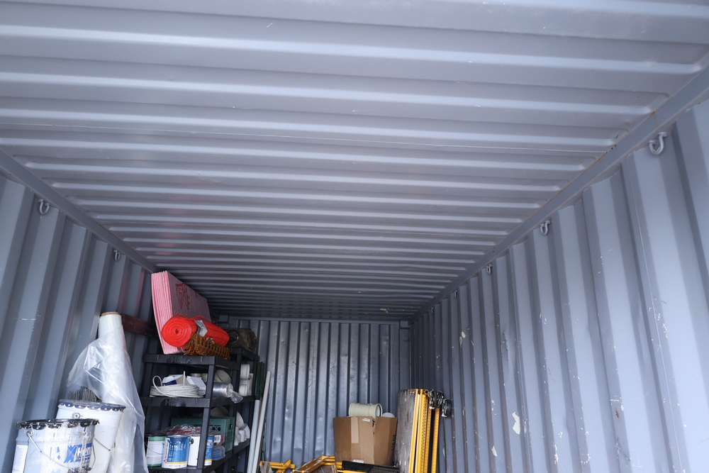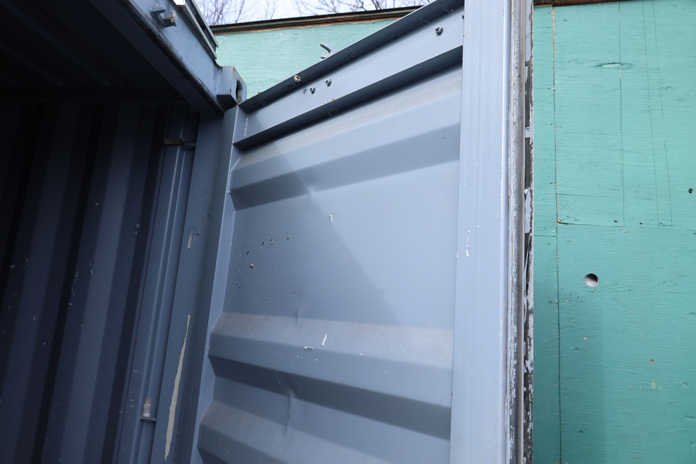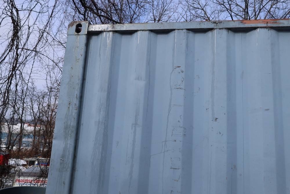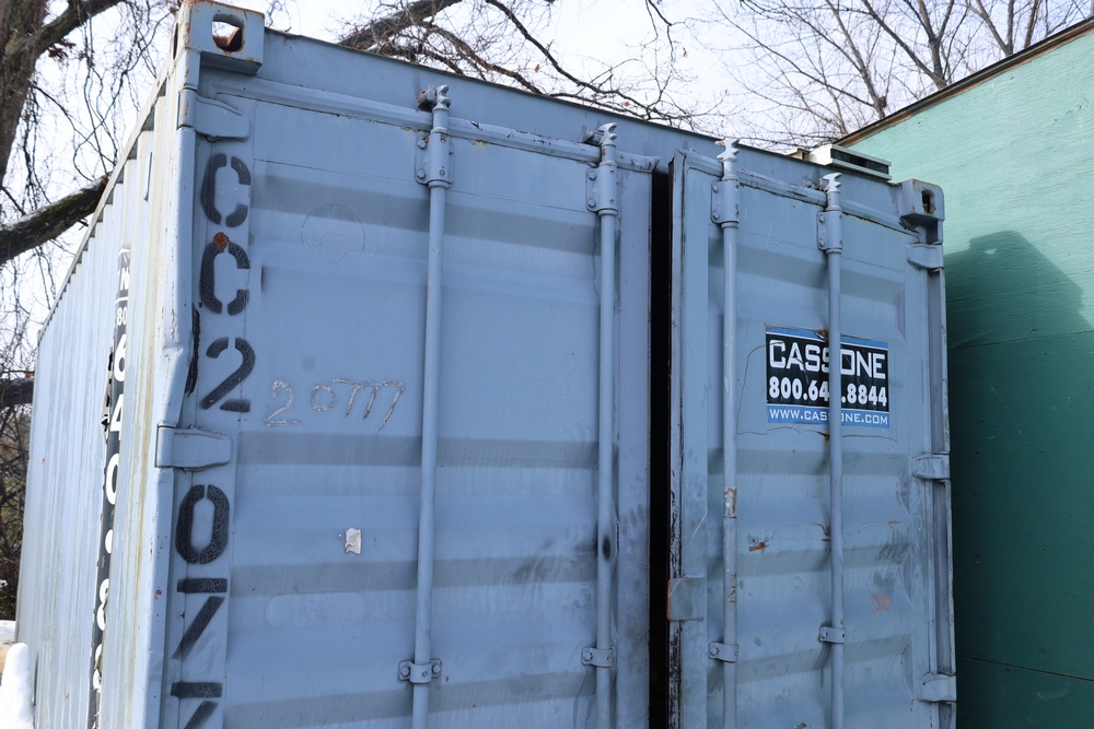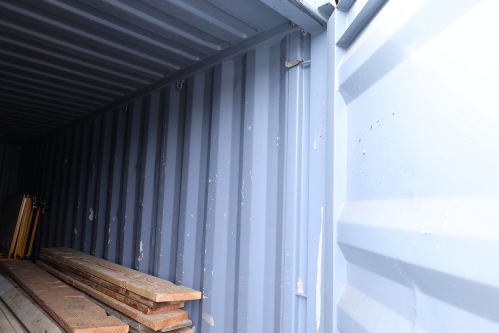 20' Steel shipping storage container with double swing doors and locking bars, painted blue, with wood plank flooring inside. Contents not included.