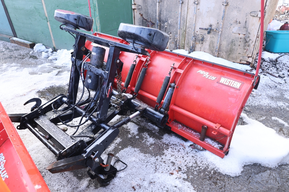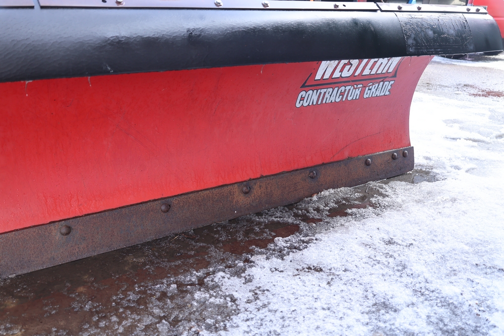 Western Pro Plus straight blade snow plow with UltraMount hookup, contractor grade, includes plow lights, hydraulic unit, wiring, and handheld controller. Truck side frame mount not included.