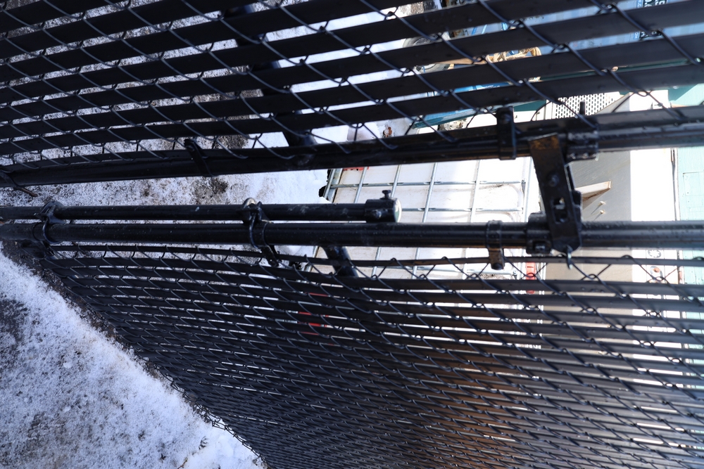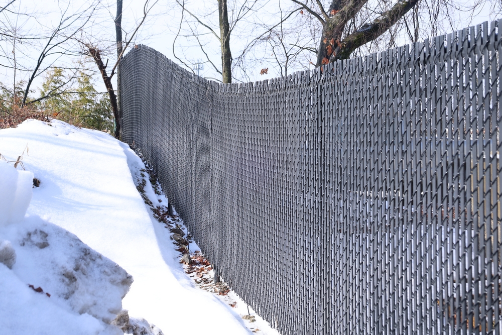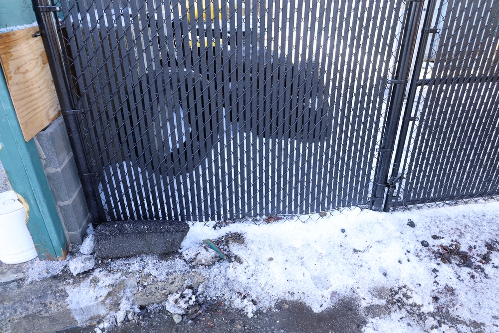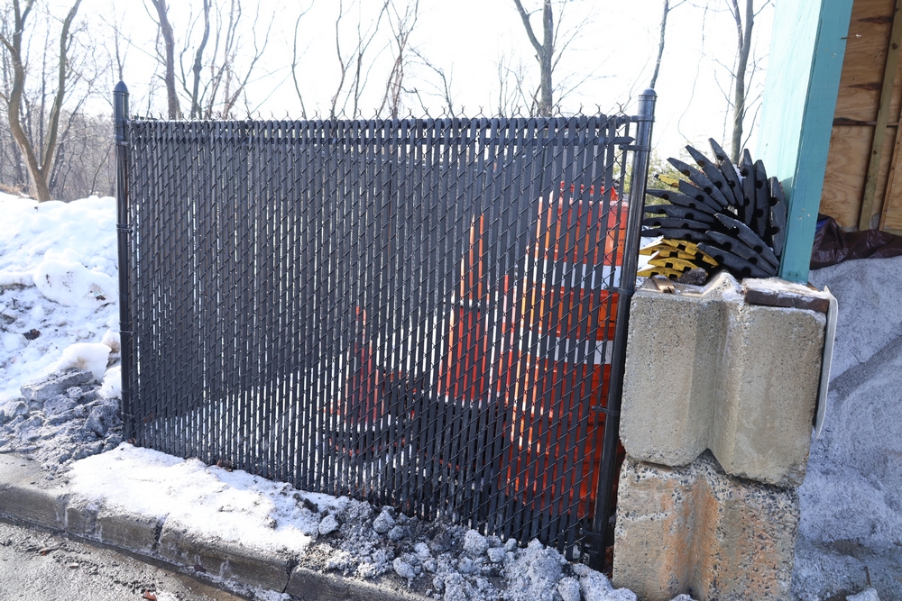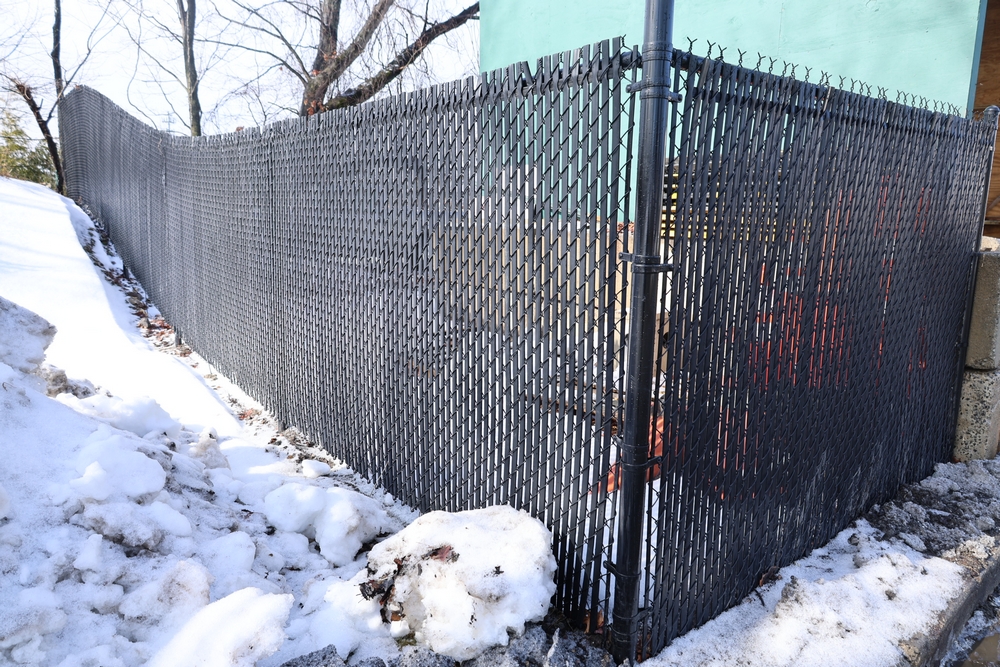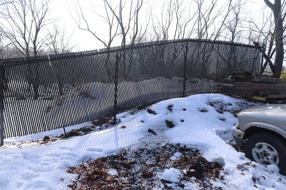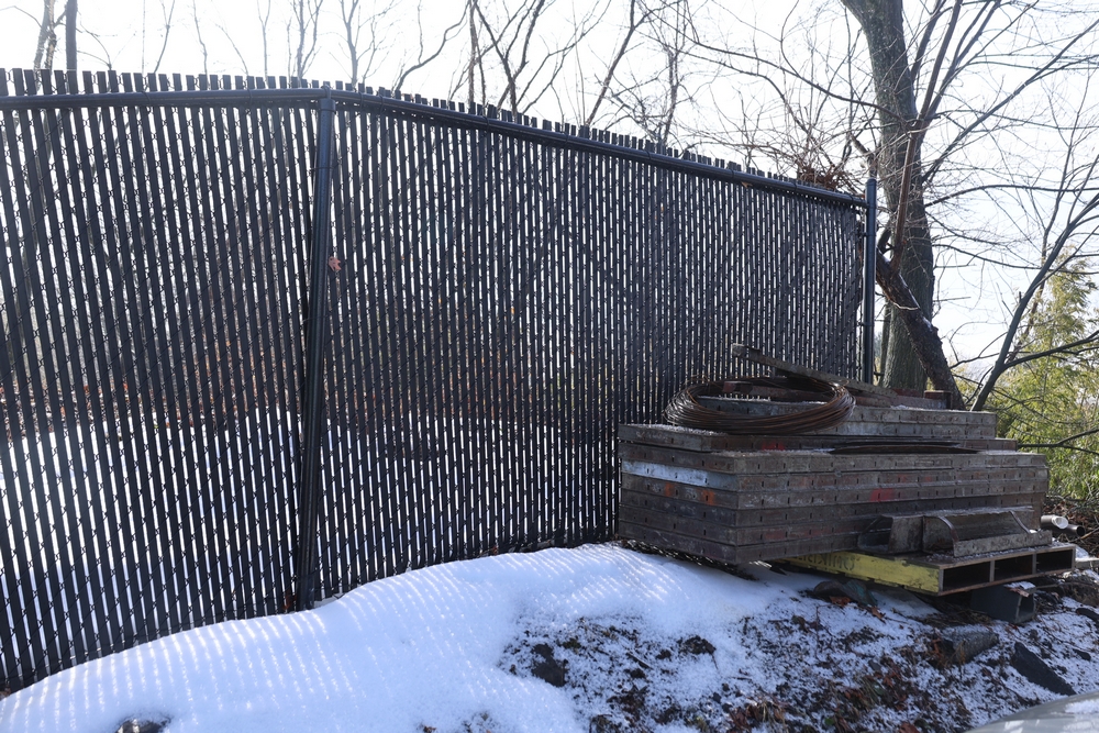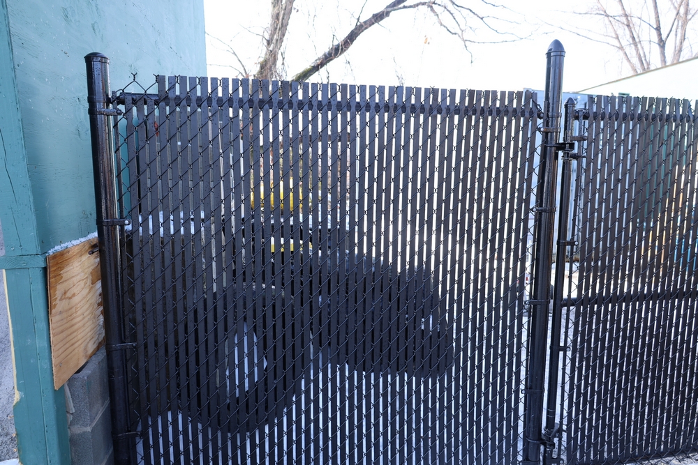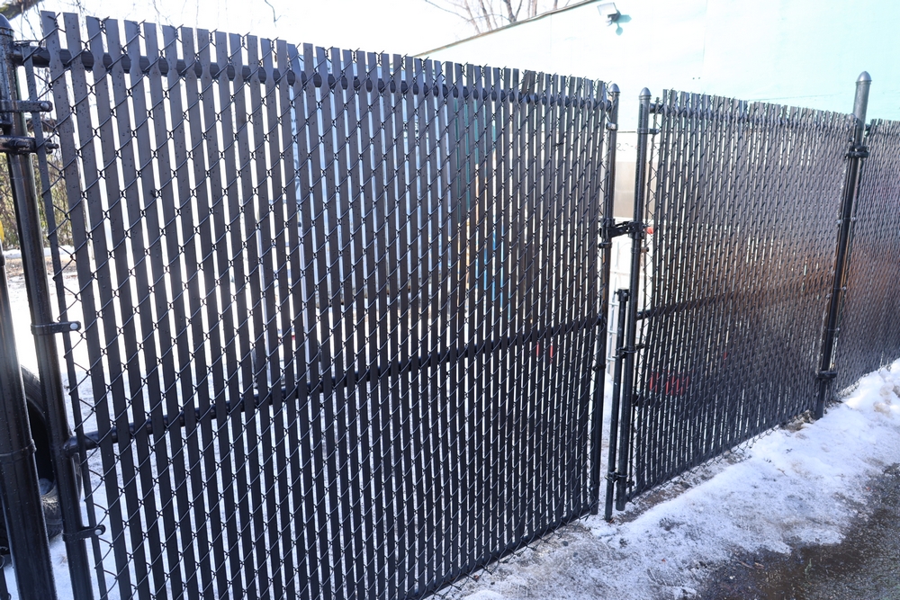 Approx 85 ft of black chain link fencing with privacy slats, includes posts and double swing gate, gate opening approximately 13 ft 6 in. Seller will disassemble for transport; buyer must call after winning to coordinate disassembly.