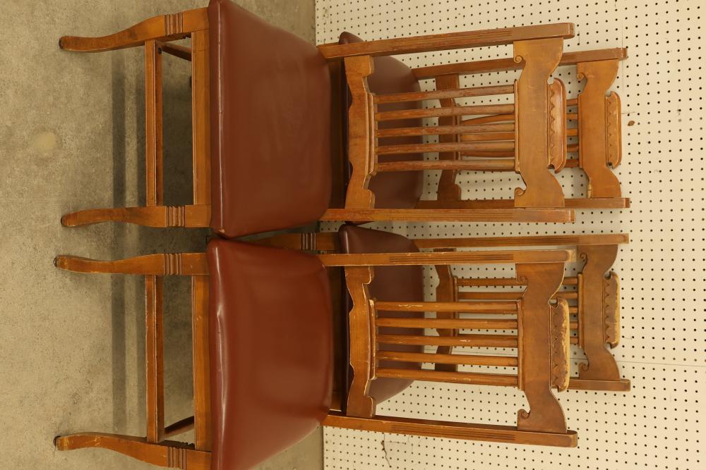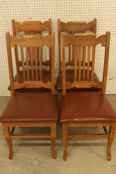 Pressed Back Oak Dining Chairs, Quantity of 4. Condition varies from chair to chair with visible wear and signs of use. The chairs feature pressed back designs with brown upholstered seats. See photos for additional details on condition. Pickup only.