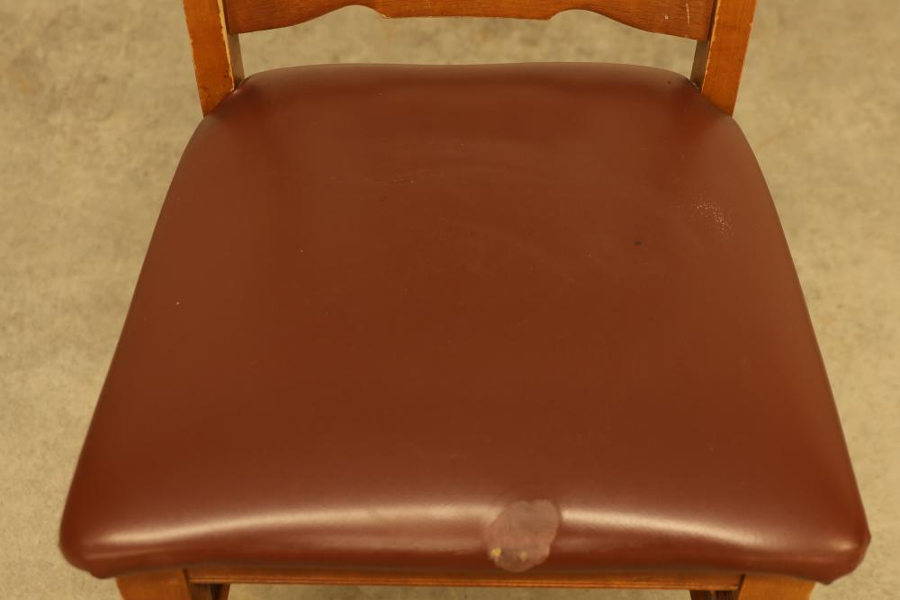Pressed Back Oak Dining Chairs, Quantity of 2. Constructed from oak with pressed back detailing and featuring brown upholstered seats. Condition varies from chair to chair. See photos for details. Pickup only.