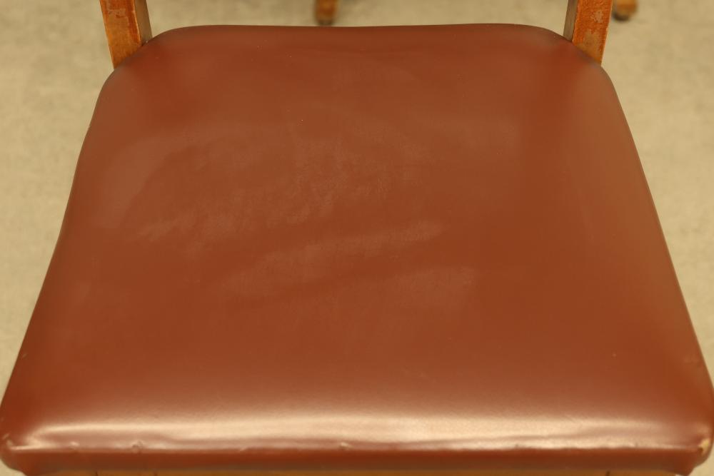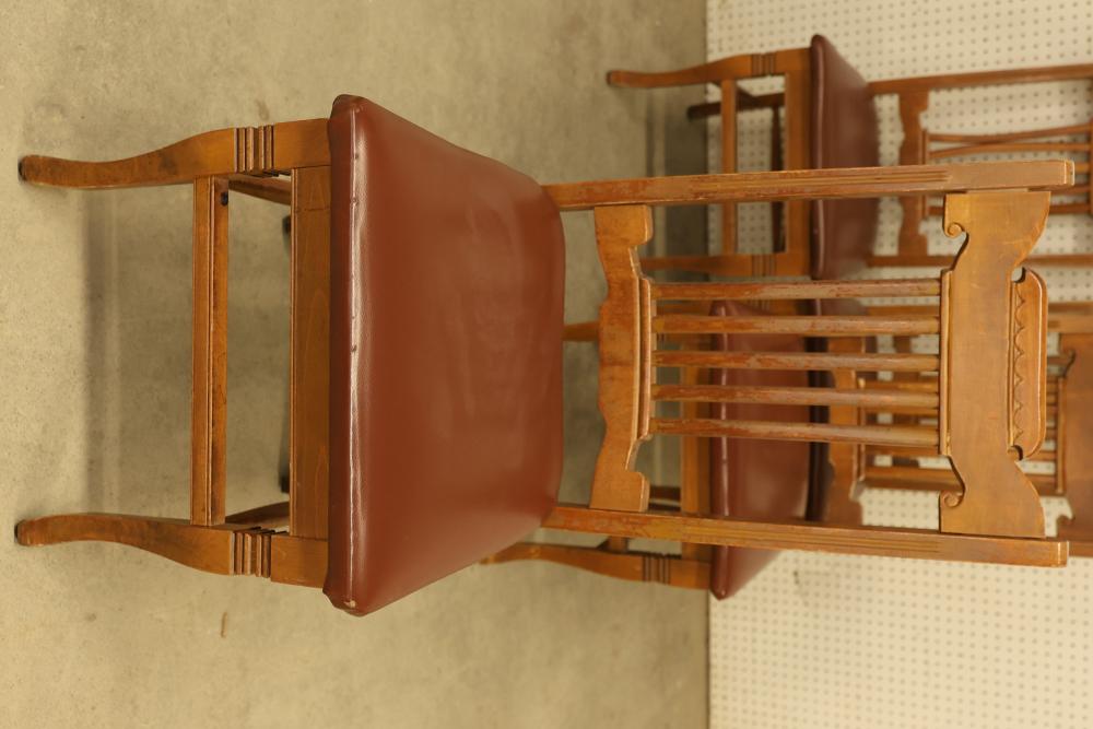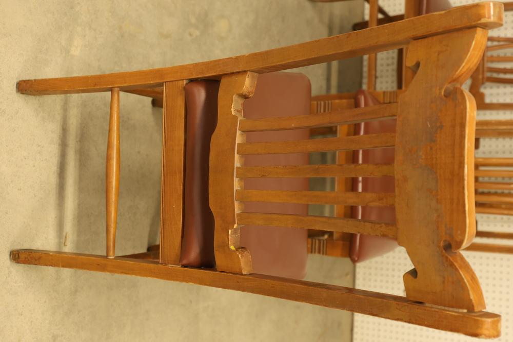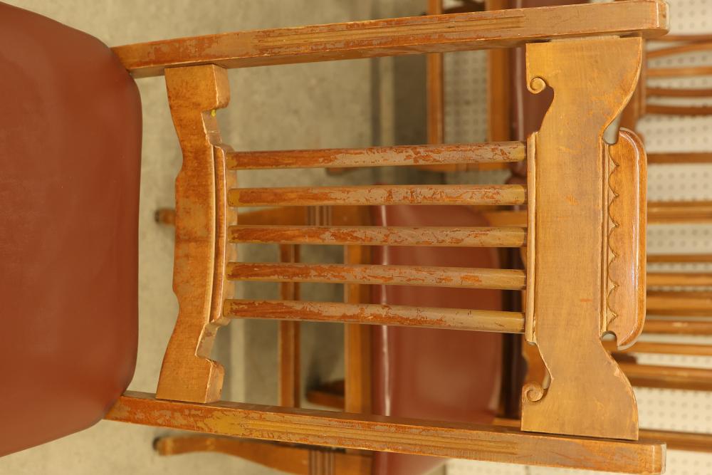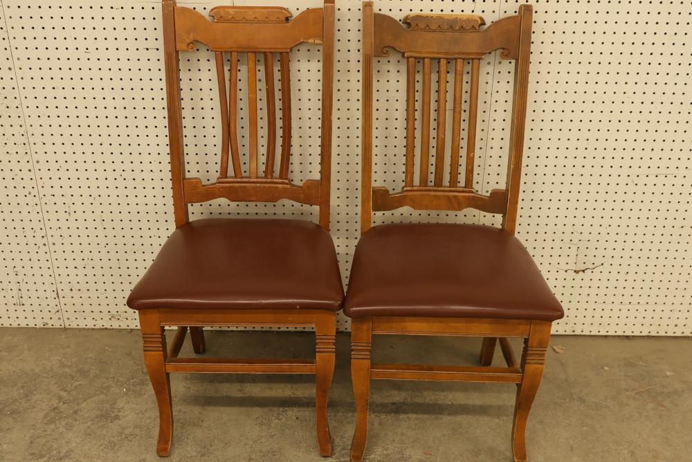 Pressed Back Oak Dining Chairs, Quantity of 4. Condition varies from chair to chair with visible wear and signs of use. The chairs feature pressed back designs with brown upholstered seats. See photos for additional details on condition. Pickup only.