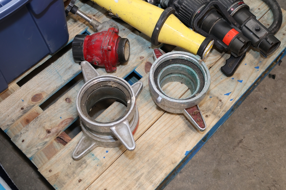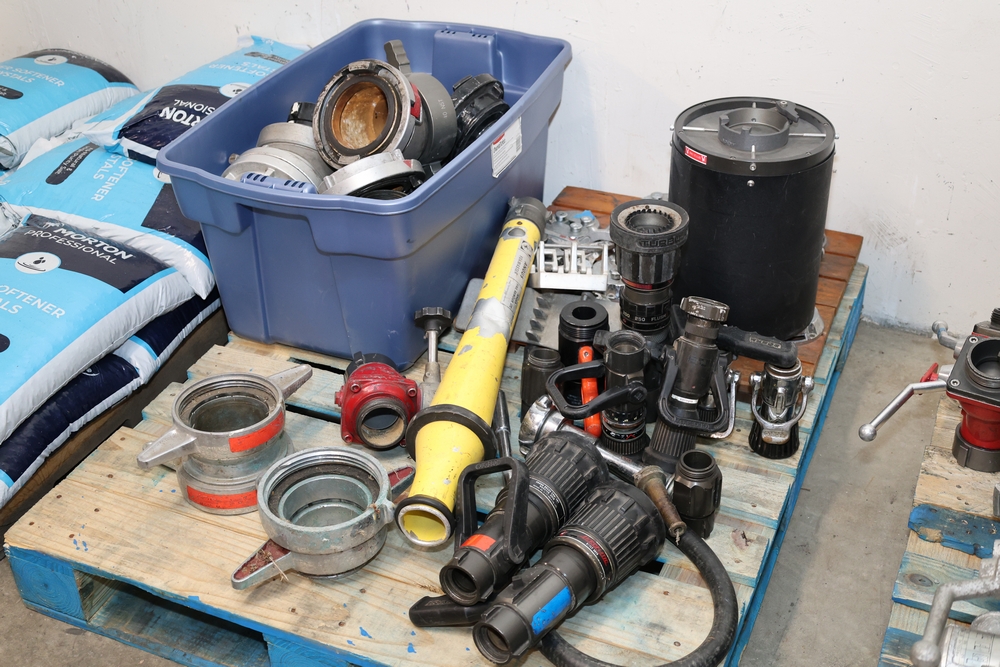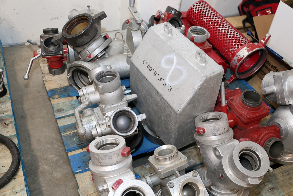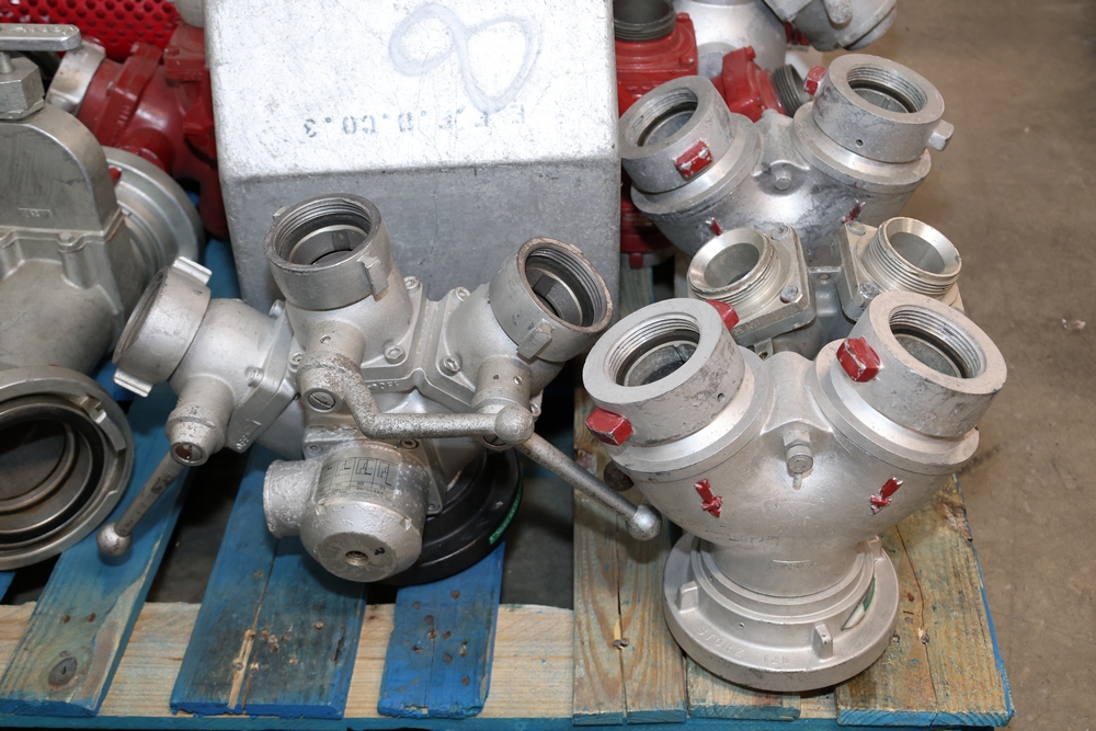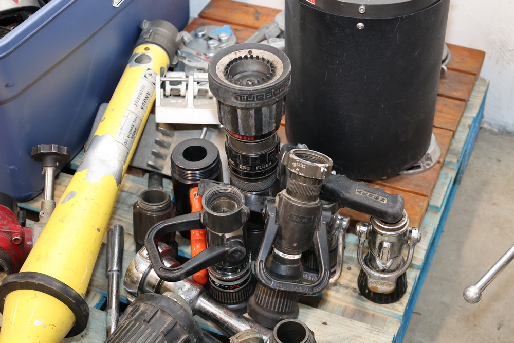 Misc. Fire appliances, including older style firefighter appliances, valves, nozzles, gates, adapters, mounts, floating strainer.