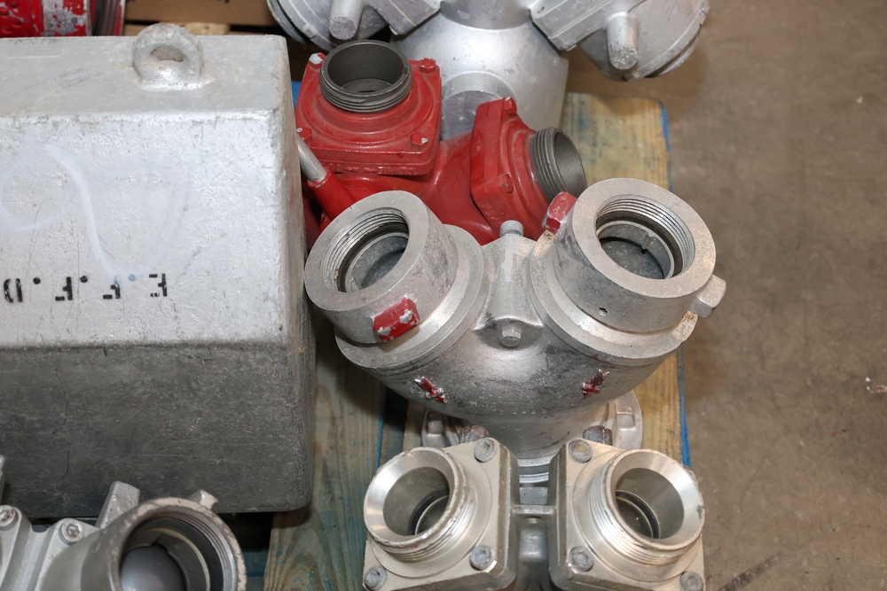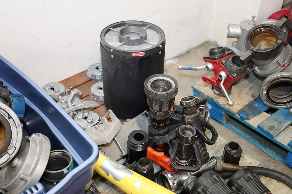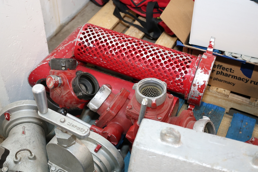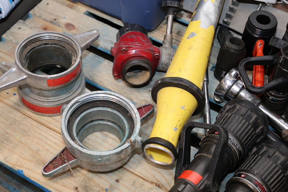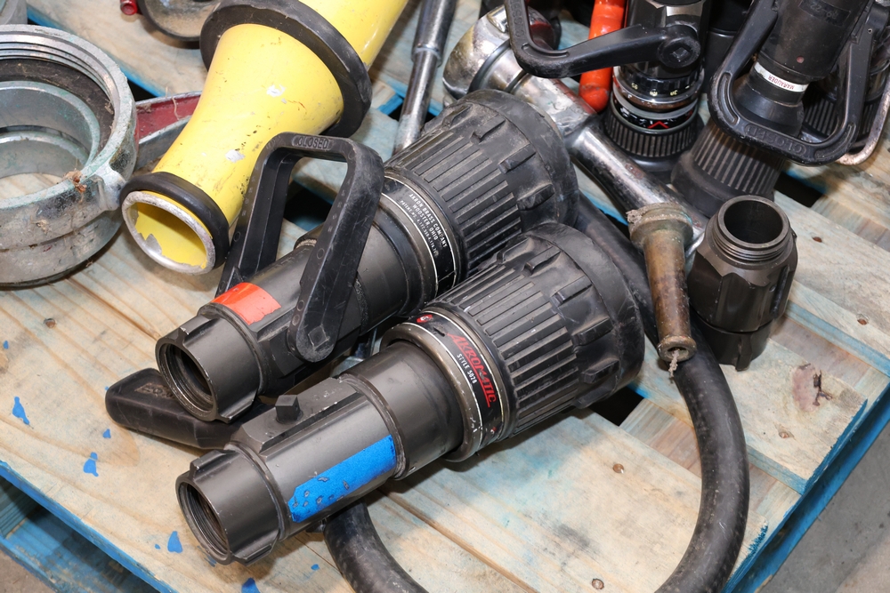 Misc. Fire appliances, including older style firefighter appliances, valves, nozzles, gates, adapters, mounts, floating strainer.