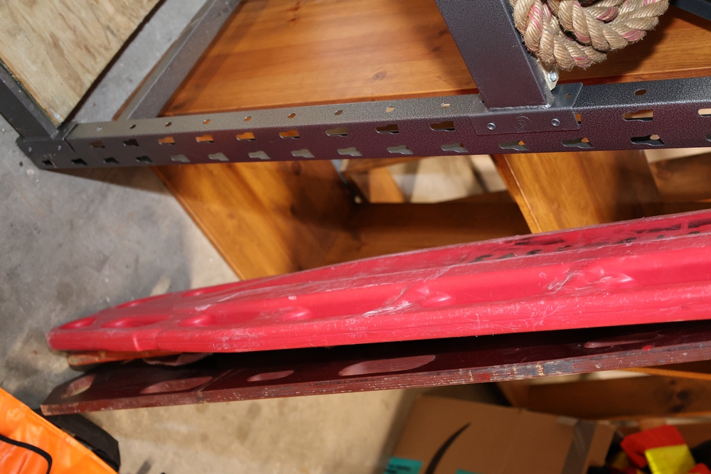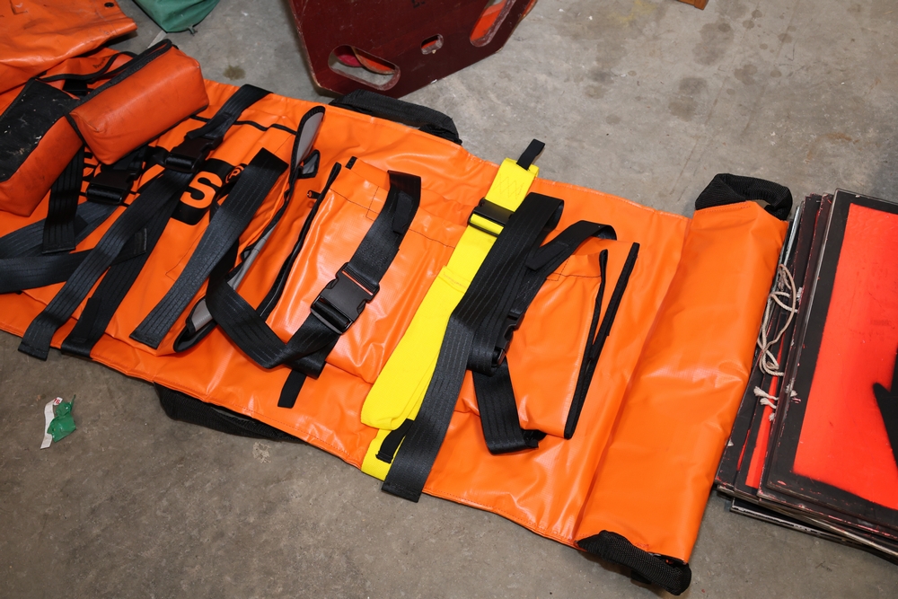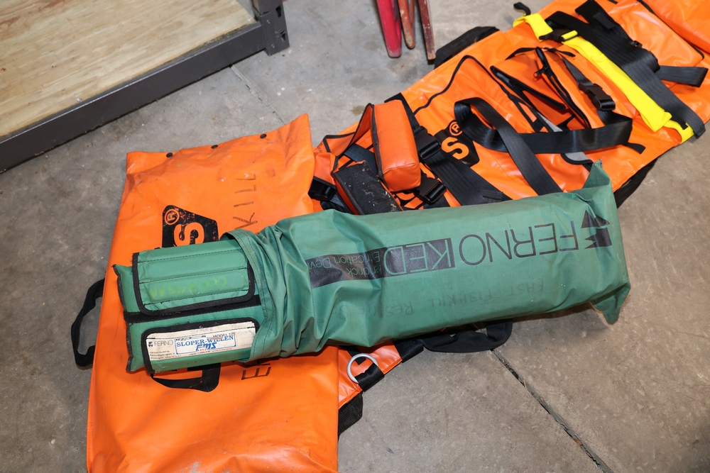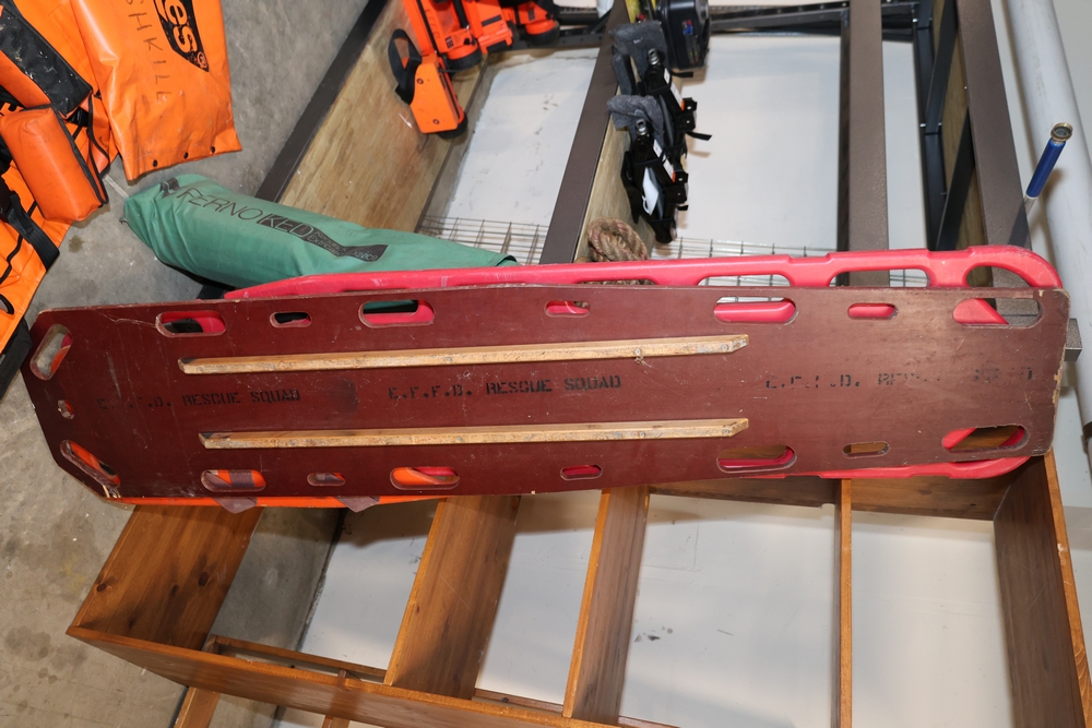 Misc. EMS supplies, (2) backboards, 1 wood, 1 plastic. (1) KED. (1) Reeves. (1) wood half backboard.