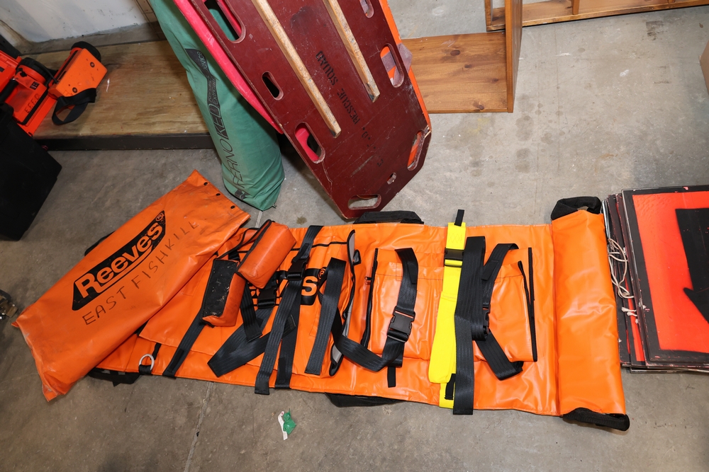 Misc. EMS supplies, (2) backboards, 1 wood, 1 plastic. (1) KED. (1) Reeves. (1) wood half backboard.