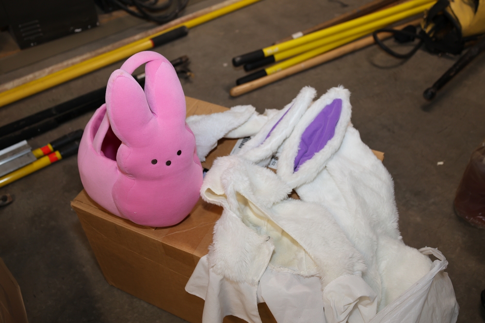 Easter accessories, Bunny costume, unknown size. Box of Easter eggs.
