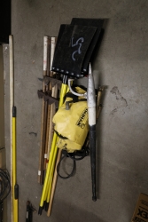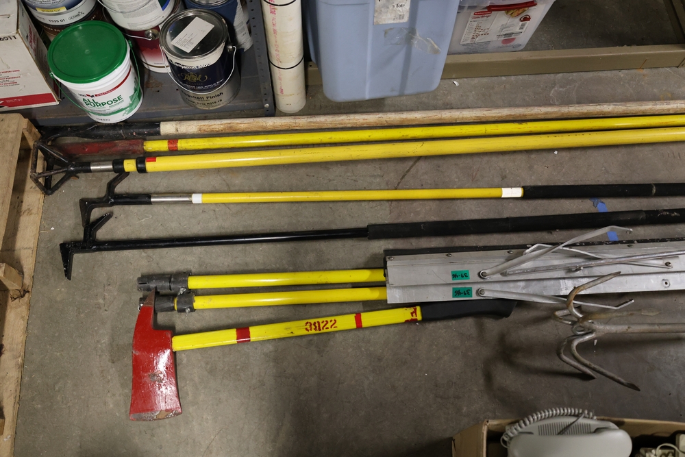 Misc. tools, (5)Brooms, pike headed axe, (1) 12' pike pole, (1) 15' pike pol, (1) extendable, 9' to 23' chimney pole. (2) random 8' poles. (2) rakes. (1) snow shovel.