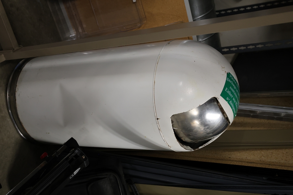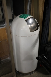 Office items including hanging document holde, trashbin, ballot box, and coat rack.