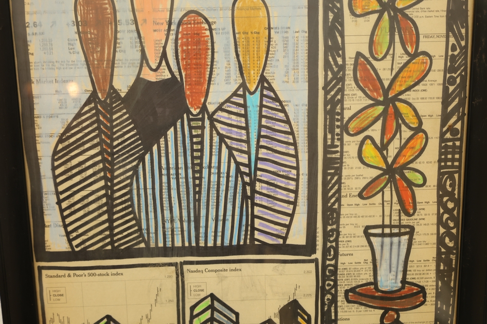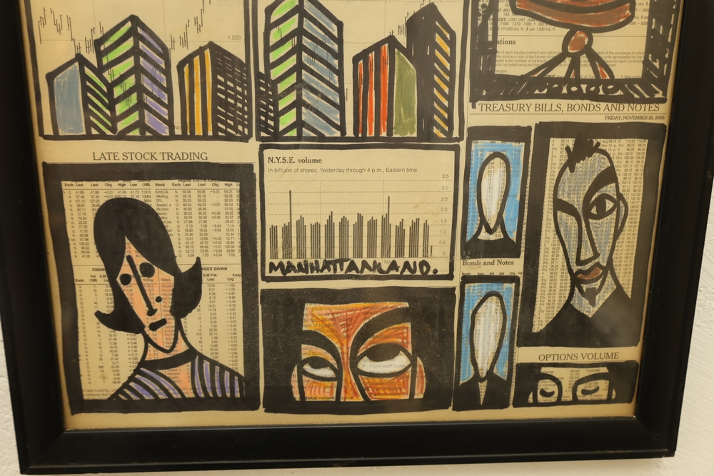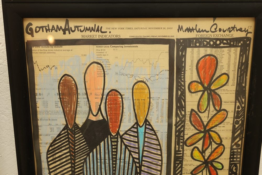 Wall art titled “Gotham Autumnal” on New York Times newspaper pages dated Saturday, November 26, 2005, with text “Marlene Courtney” at top and illustrations of figures, flowers, and buildings over stock market pages, approximately 24 x 15 inches overall.