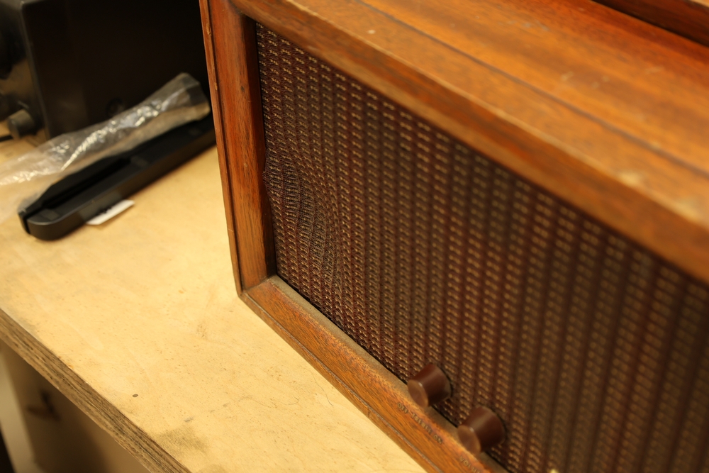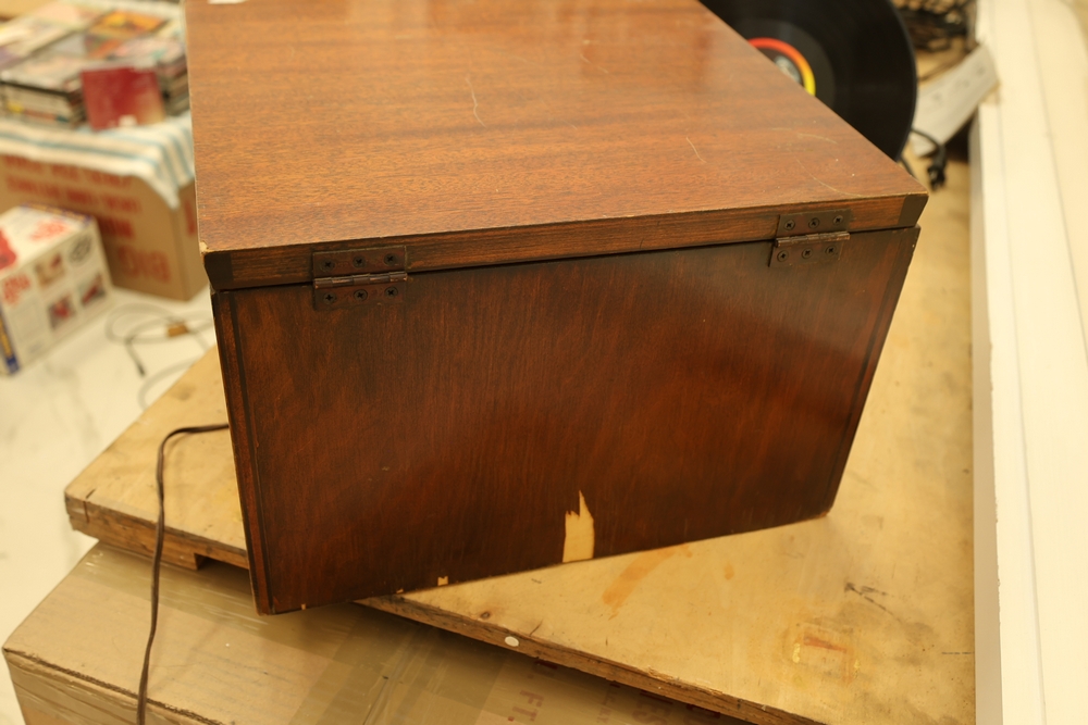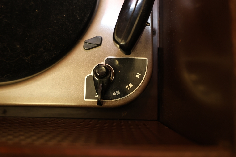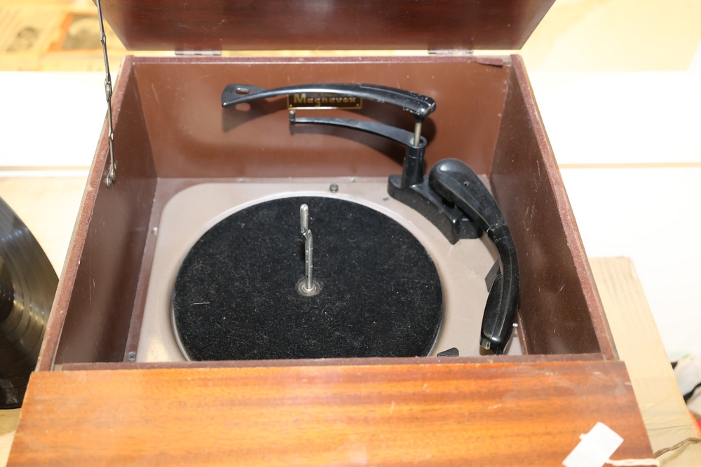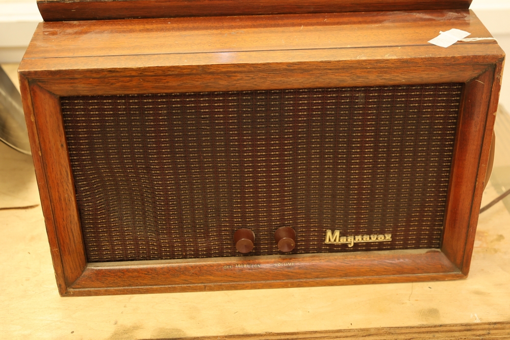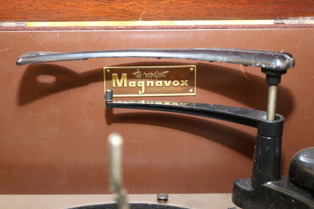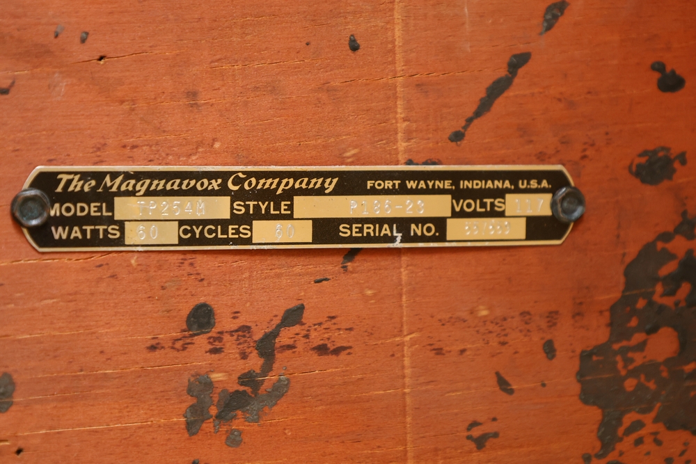 Magnavox record player console model TP254M, style P186-23, with hinged lid, front speaker grille, two control knobs, and speed selector marked 16, 33, 45, and 78.