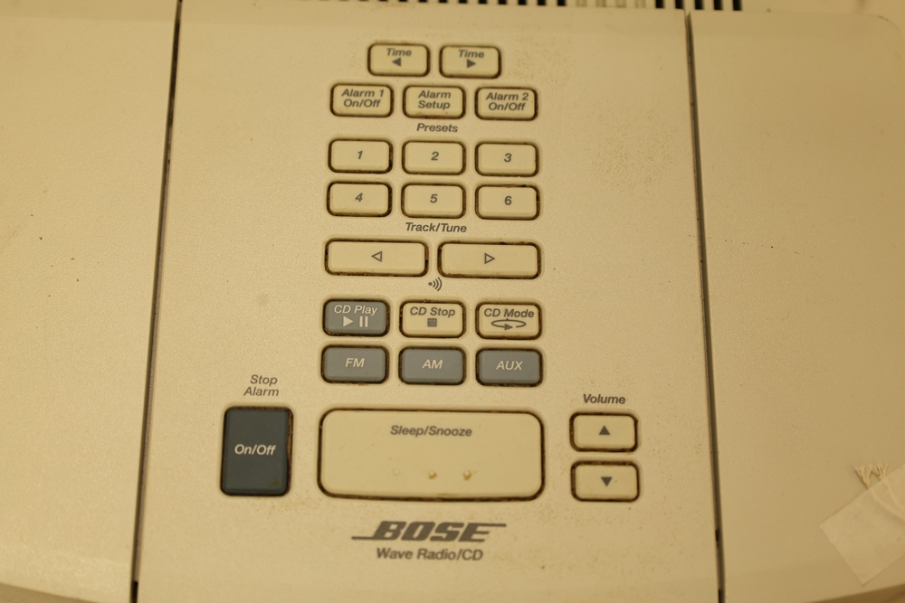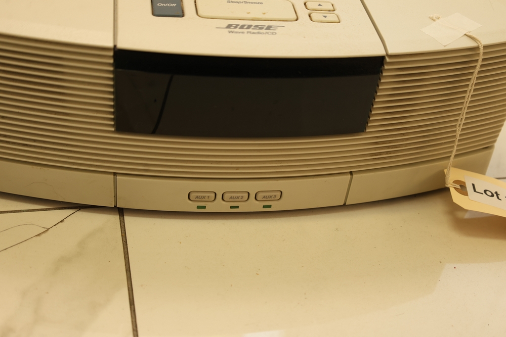 Bose Wave Radio/CD pedestal model AWACCCQ with top control panel, AM/FM and CD controls, Sleep/Snooze button, and AUX 1, AUX 2, and AUX 3 inputs.