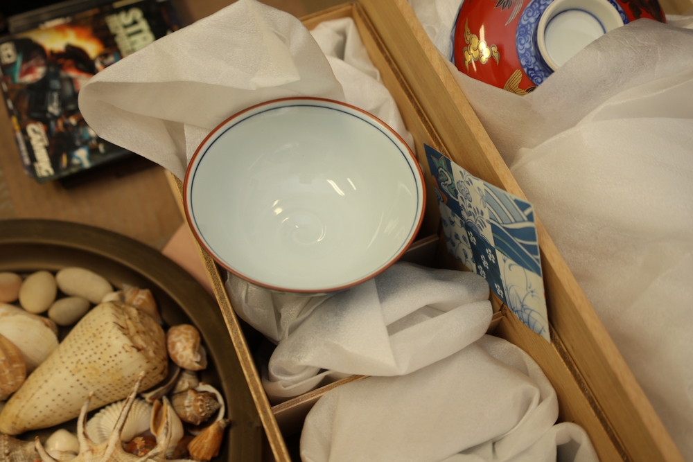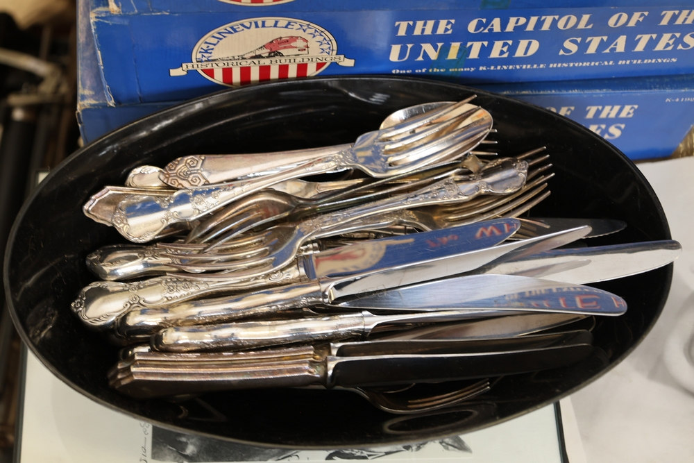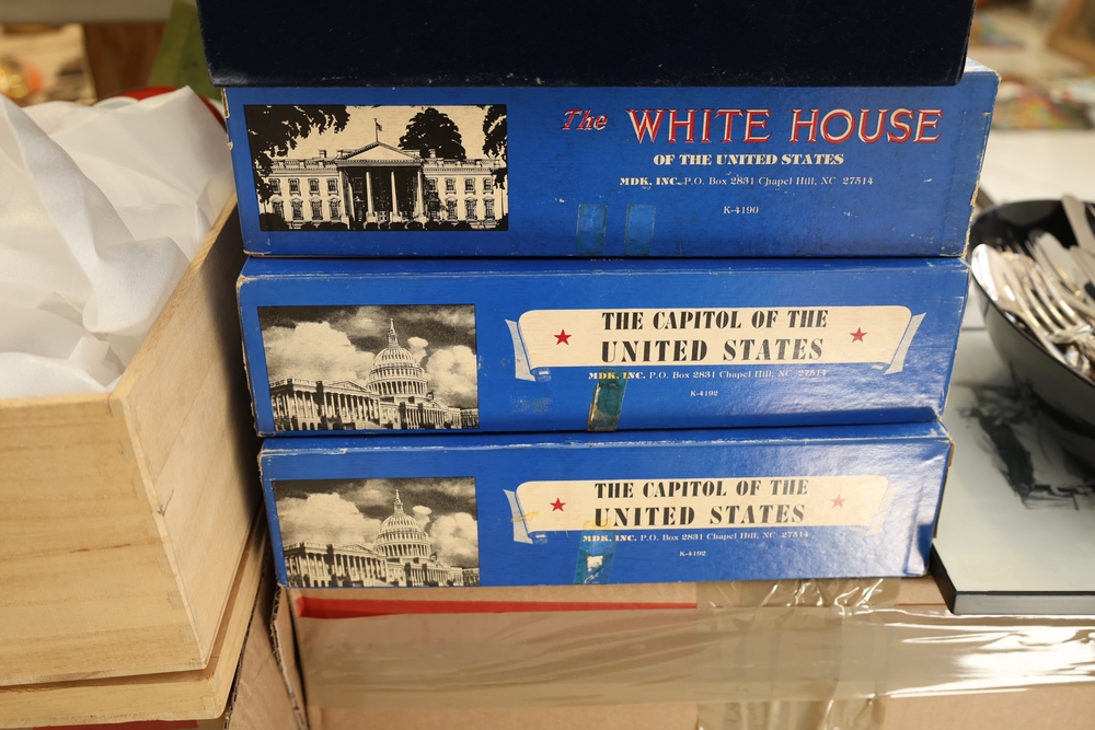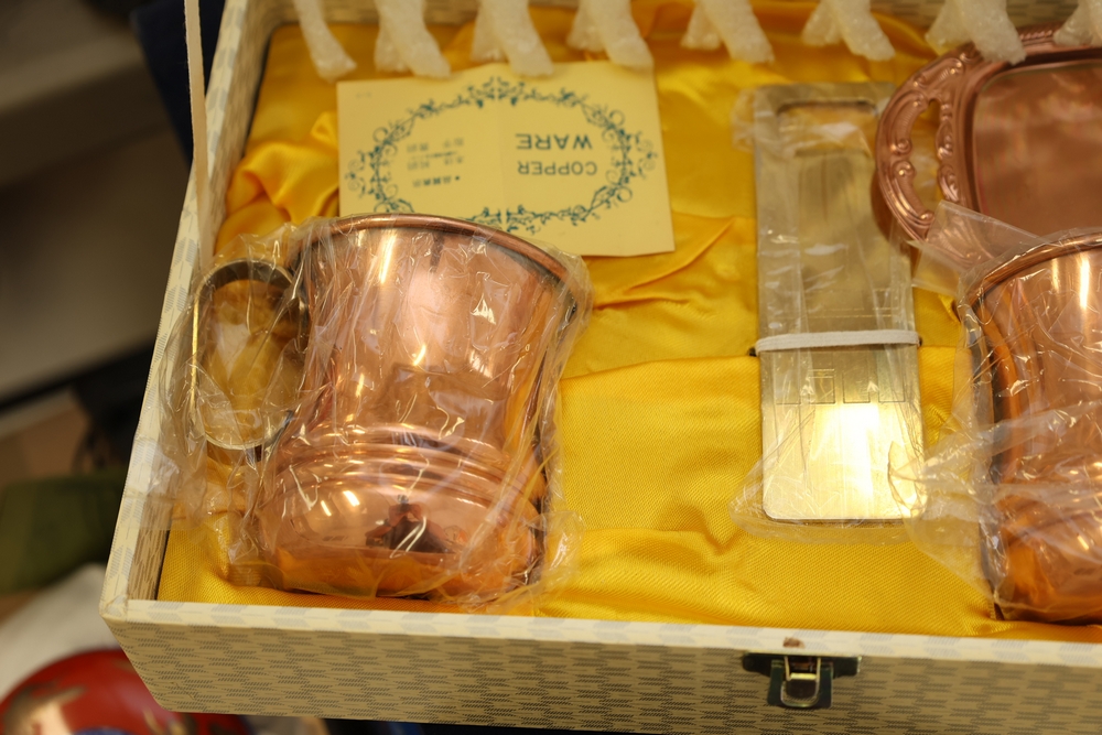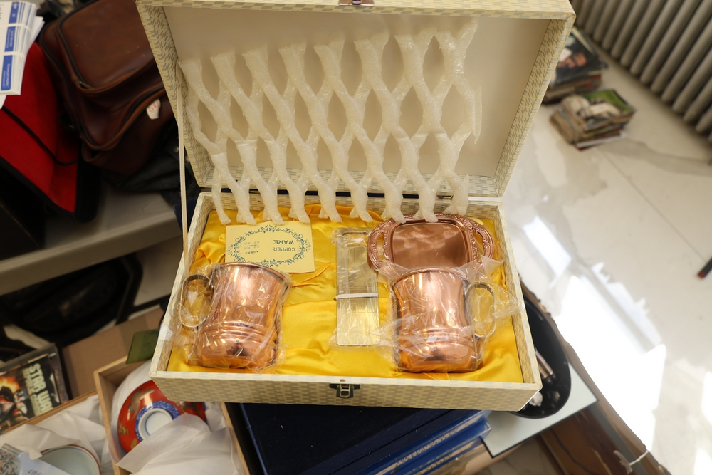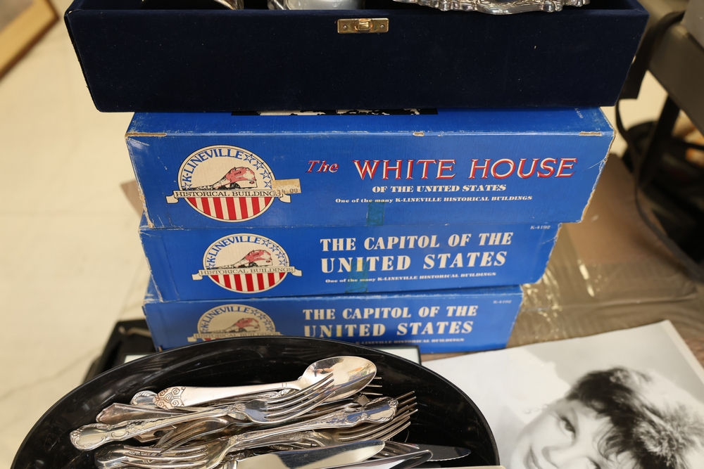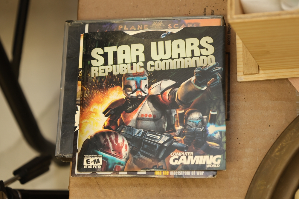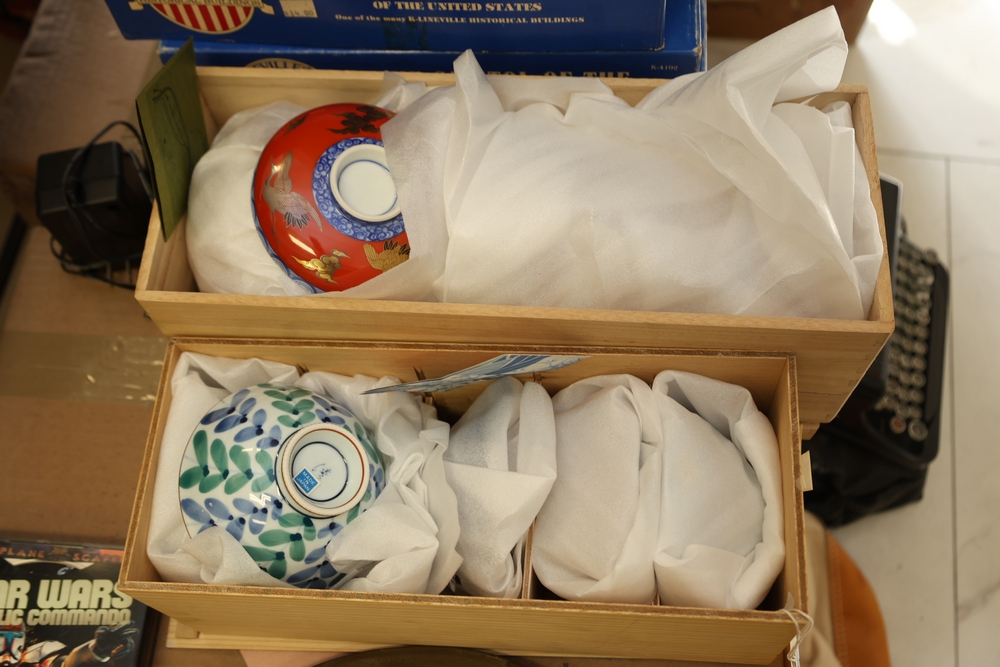 Mixed lot including Royal manual typewriter, copper mug gift set in box, Japanese porcelain tea cups in wooden box, assorted flatware, seashells on tray, CD-ROM computer games including Star Wars Republic Commando, K-Lineville historical building model kits in boxes, handbags, and framed photograph.