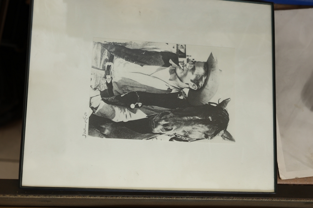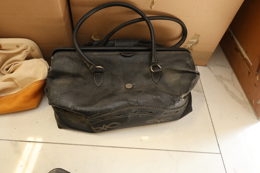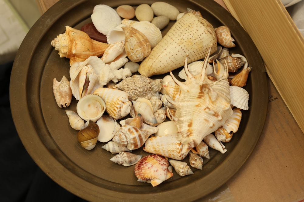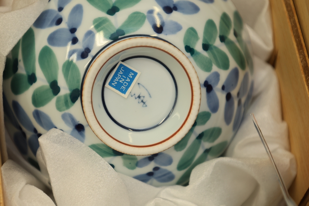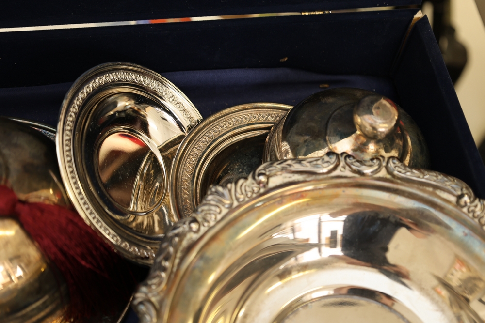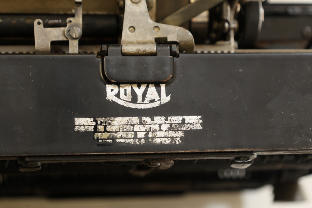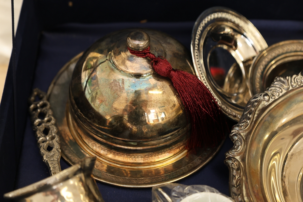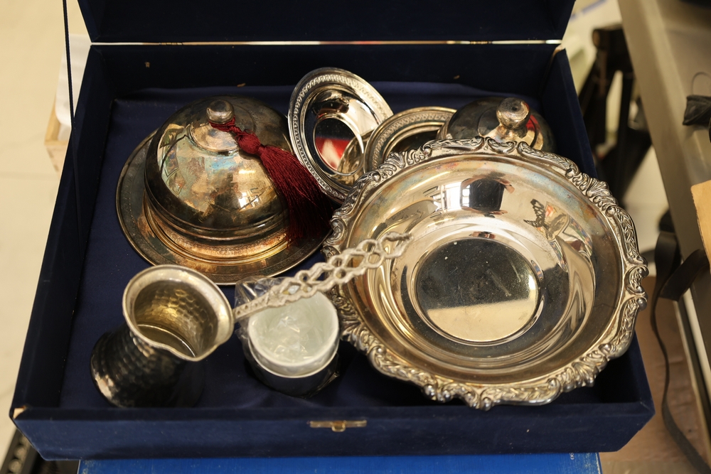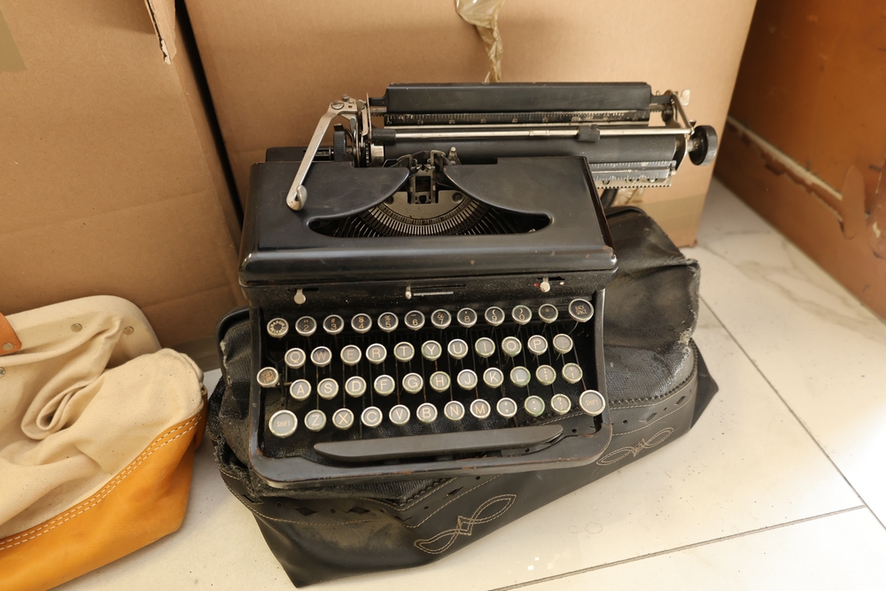 Mixed lot including Royal manual typewriter, copper mug gift set in box, Japanese porcelain tea cups in wooden box, assorted flatware, seashells on tray, CD-ROM computer games including Star Wars Republic Commando, K-Lineville historical building model kits in boxes, handbags, and framed photograph.