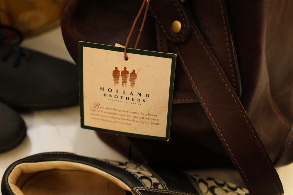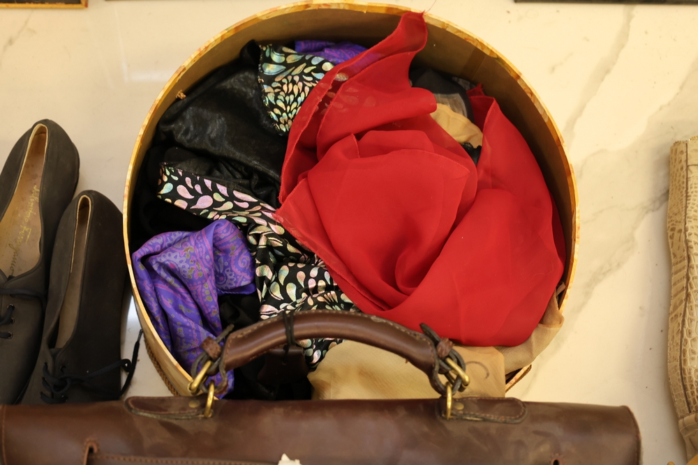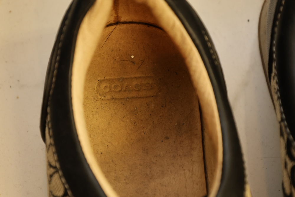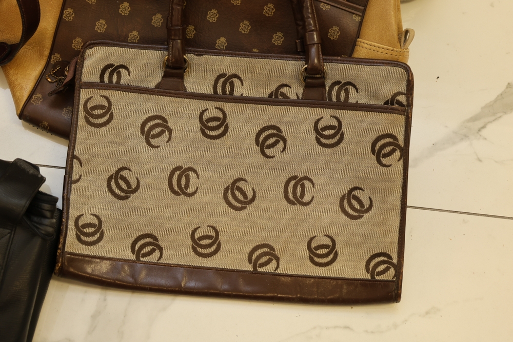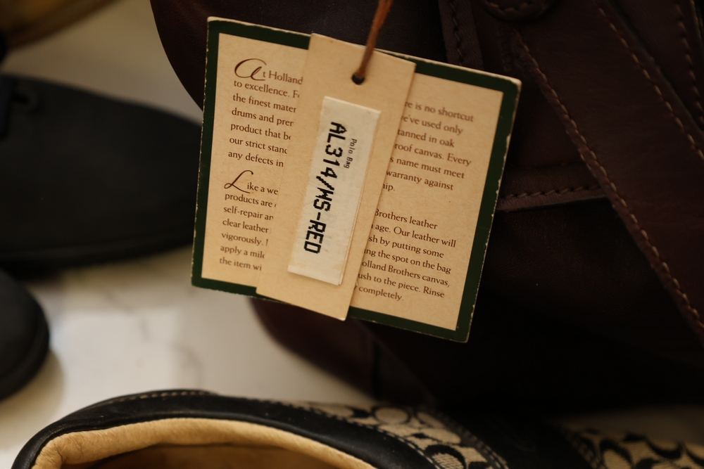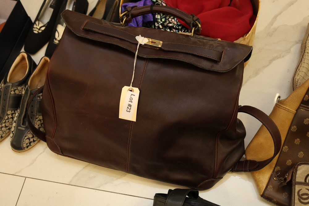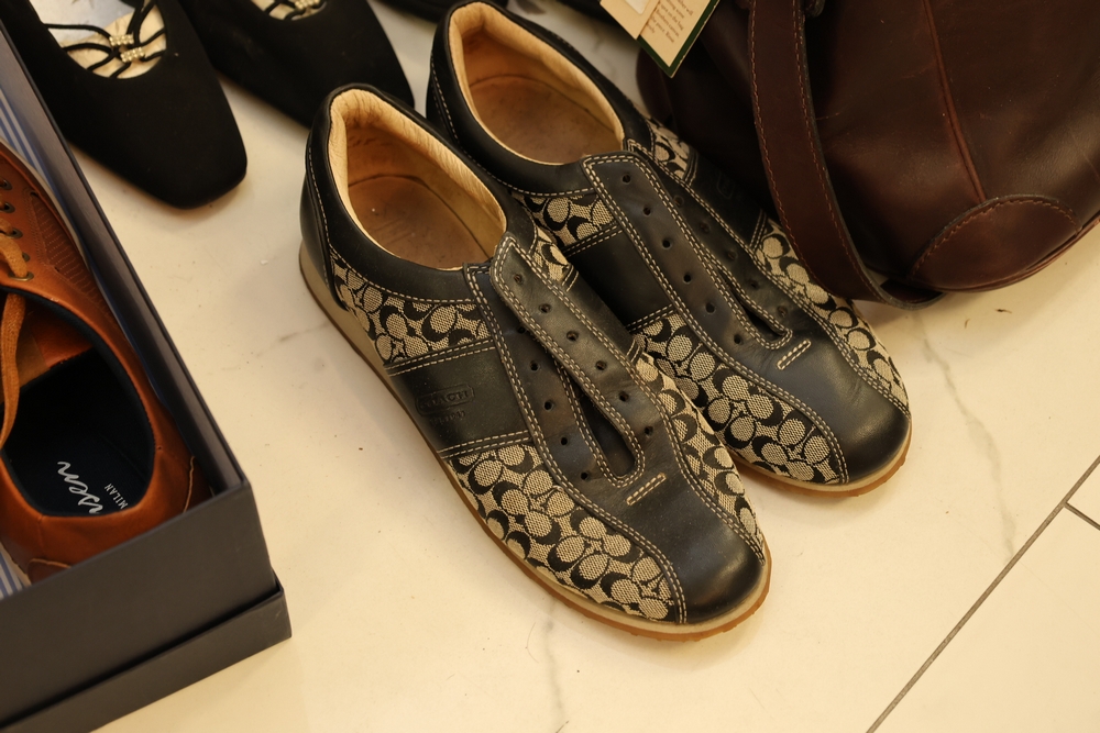 Group of handbags, scarves, and shoes including Holland Brothers leather polo bag (new with tag), Coach monogram sneakers, Stuart Weitzman flats, Salvatore Ferragamo Boutique flats, pair of brown Milano sneakers in box, and additional handbags.