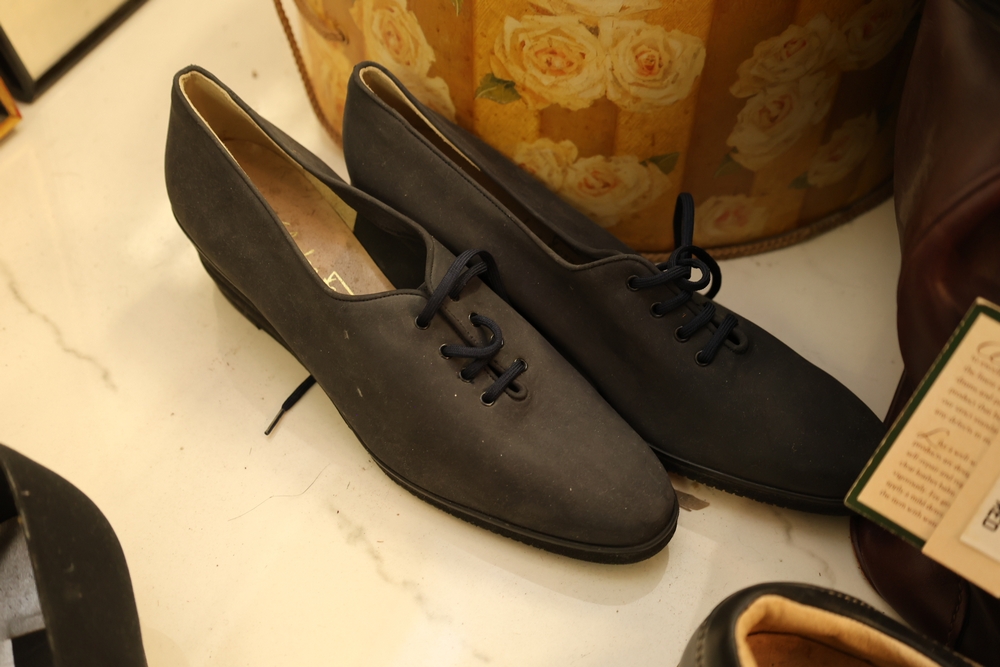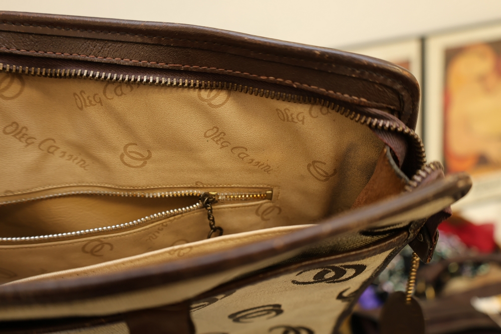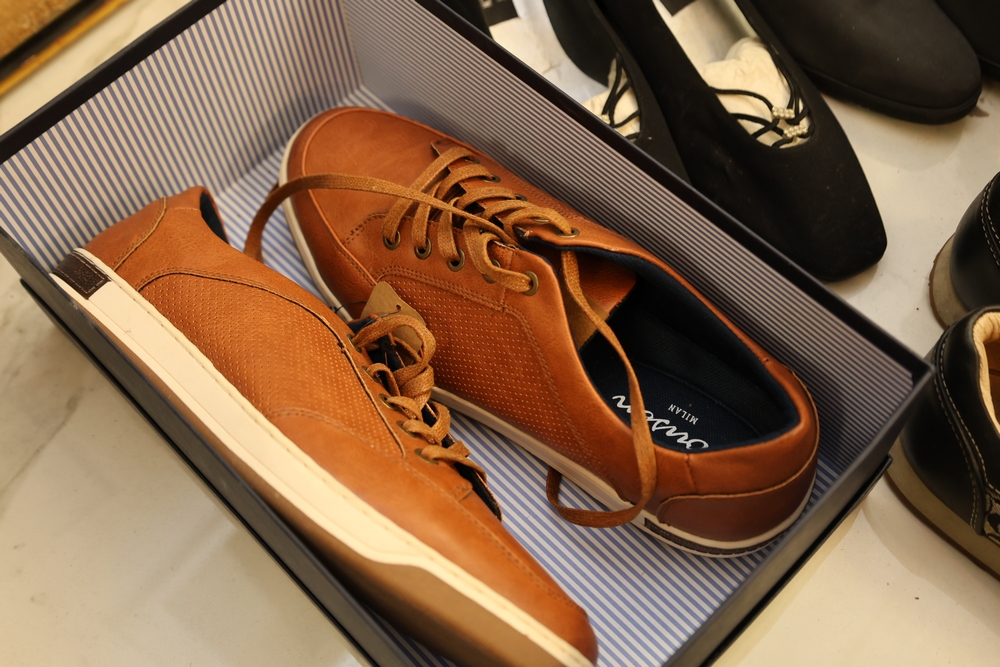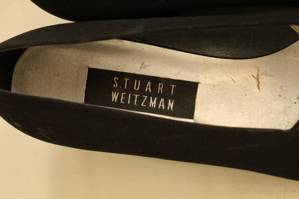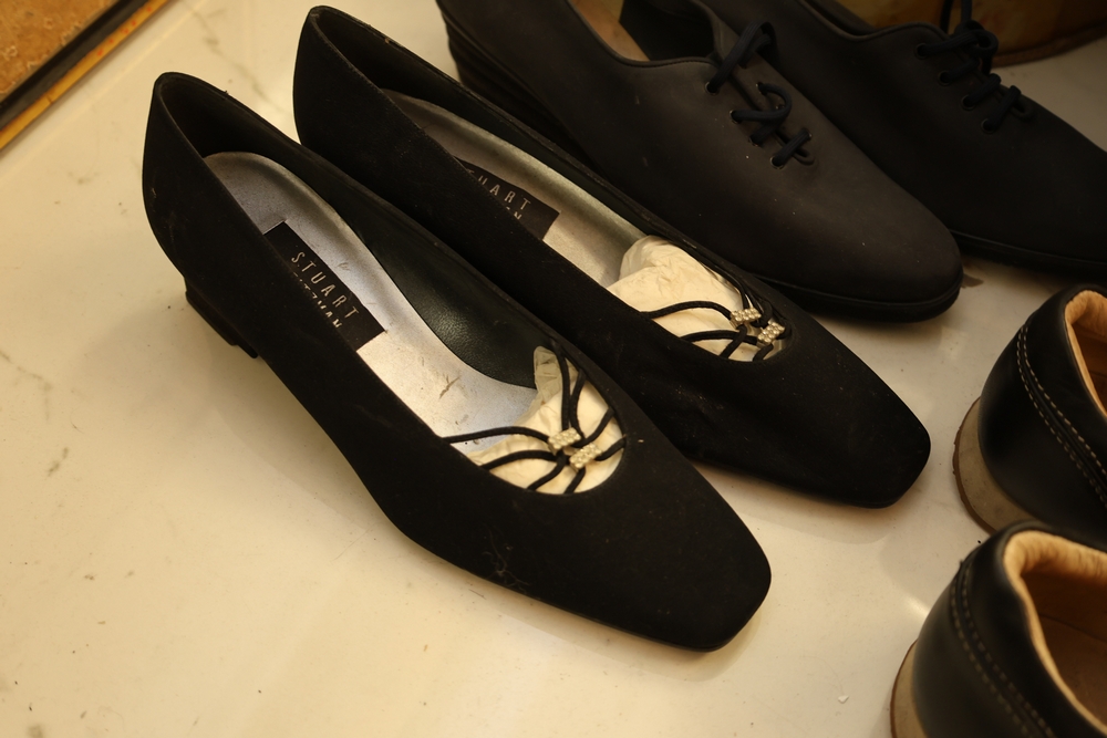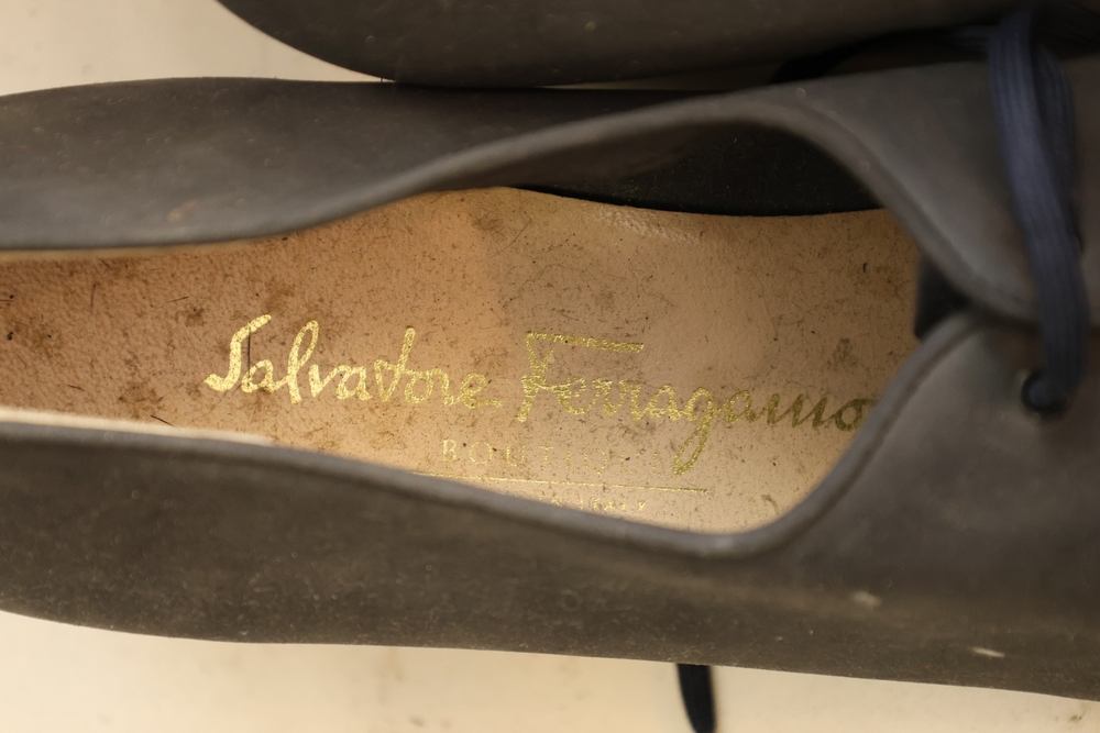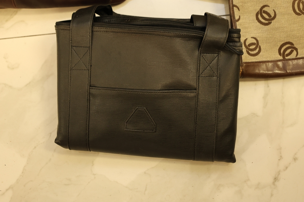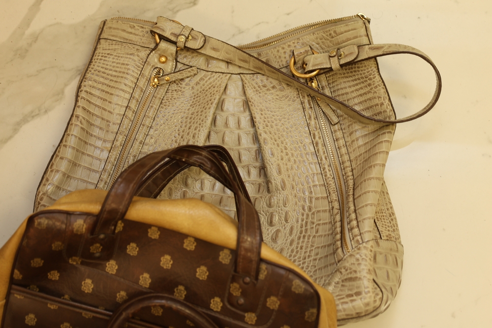Group of handbags, scarves, and shoes including Holland Brothers leather polo bag (new with tag), Coach monogram sneakers, Stuart Weitzman flats, Salvatore Ferragamo Boutique flats, pair of brown Milano sneakers in box, and additional handbags.