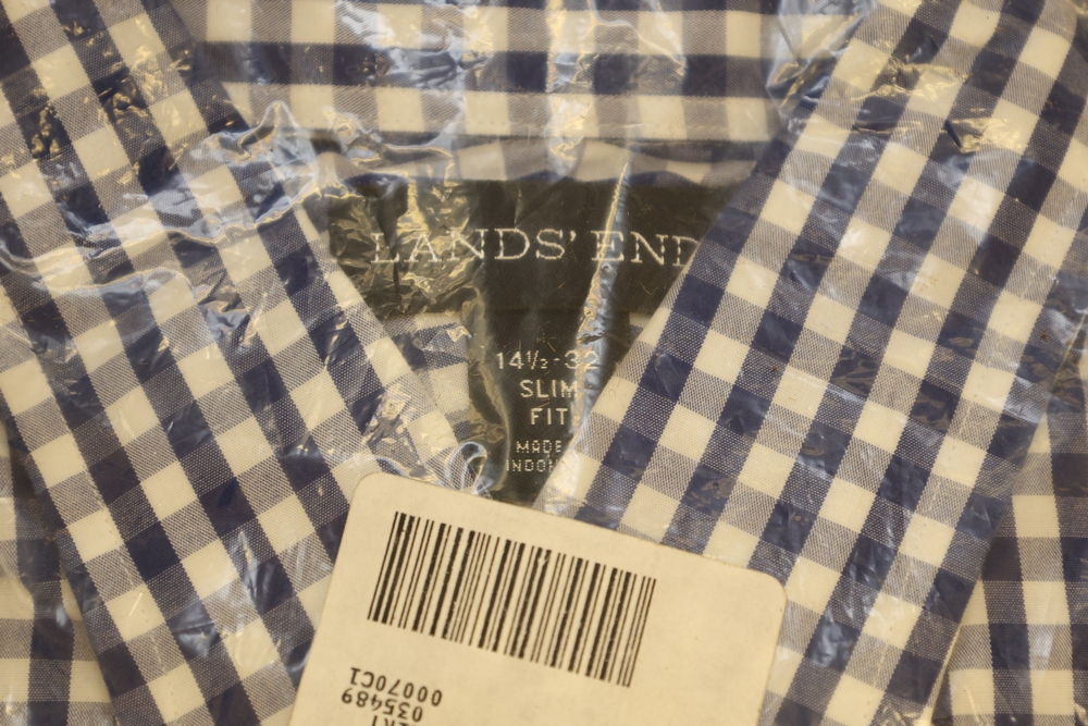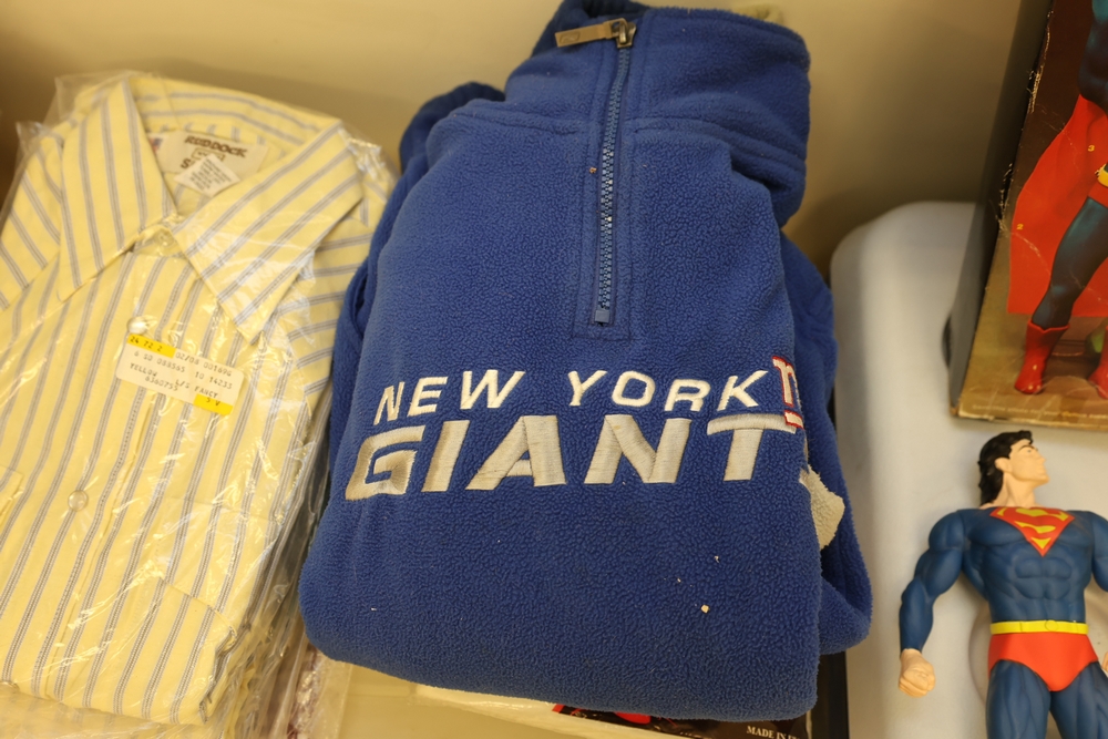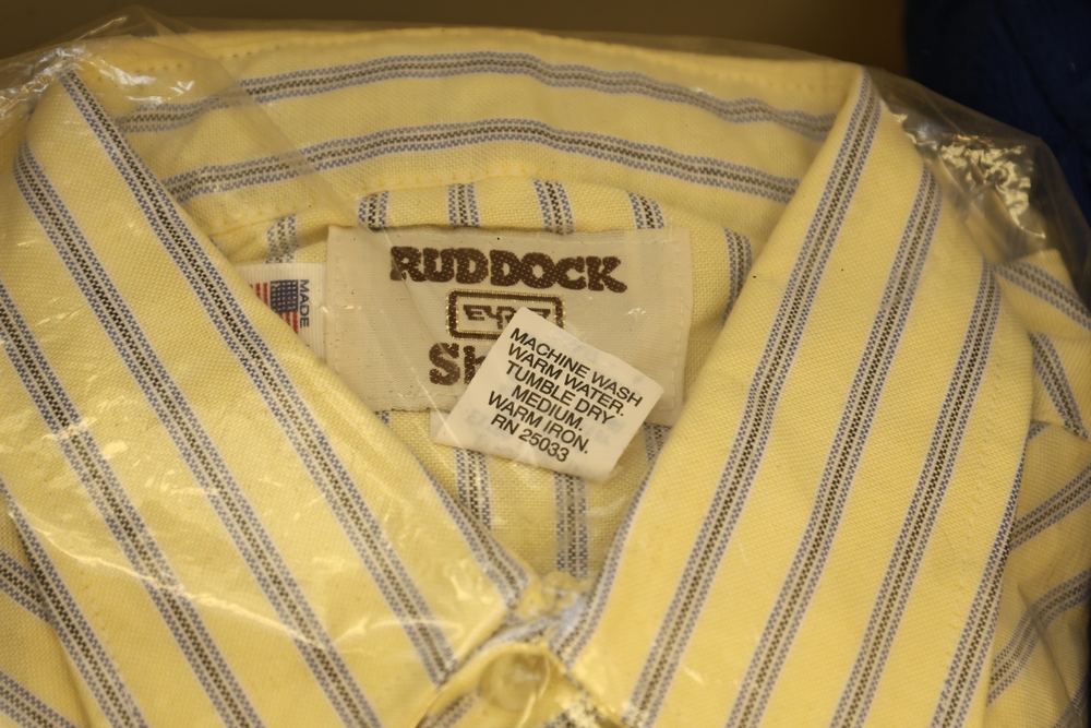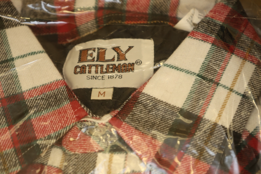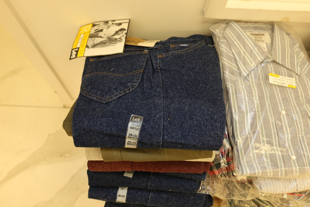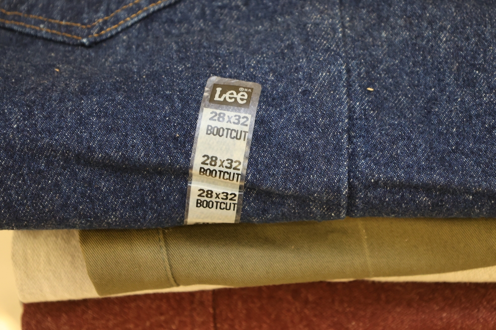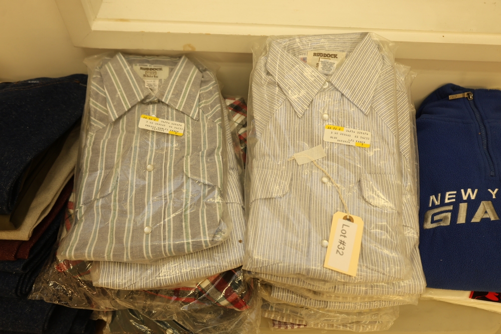 Group of clothing including Lee bootcut jeans (28 x 32), multiple packaged western shirts including Ruddock and Ely Cattleman brands, Lands End shirt, New York Giants fleece pullover, and Jockey for Boys three pack T shirts.
