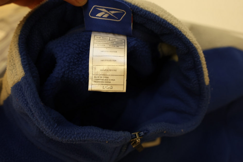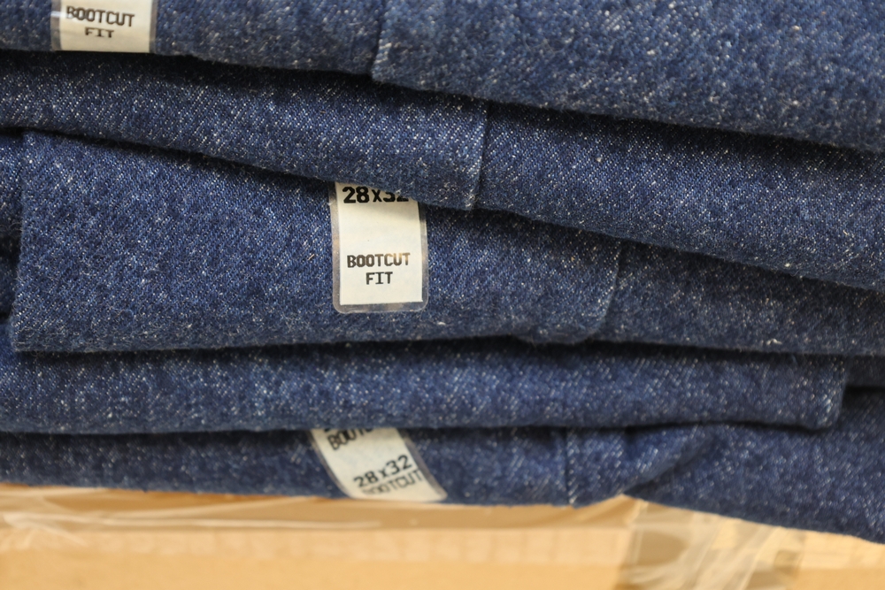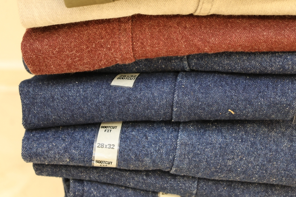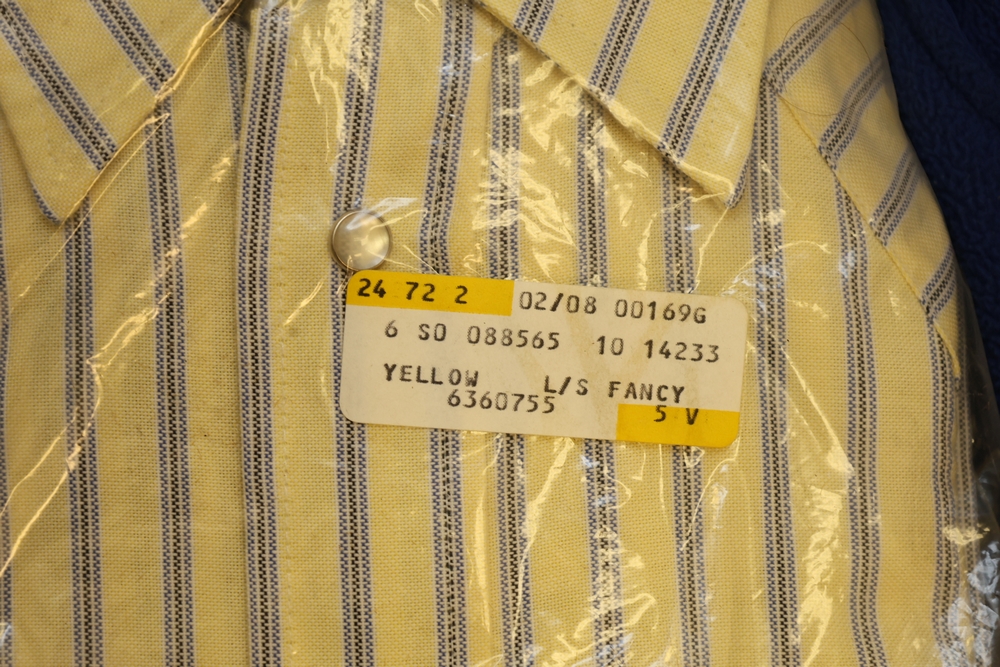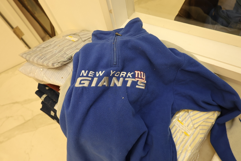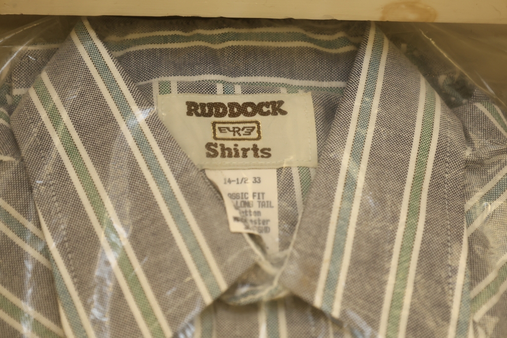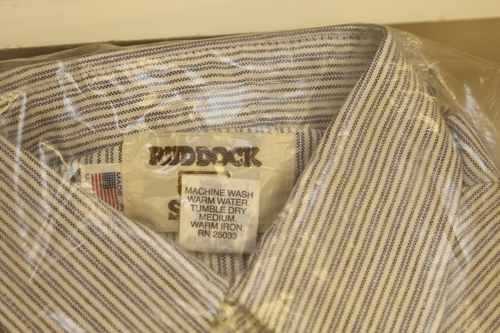 Group of clothing including Lee bootcut jeans (28 x 32), multiple packaged western shirts including Ruddock and Ely Cattleman brands, Lands End shirt, New York Giants fleece pullover, and Jockey for Boys three pack T shirts.