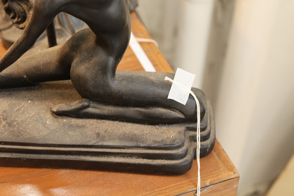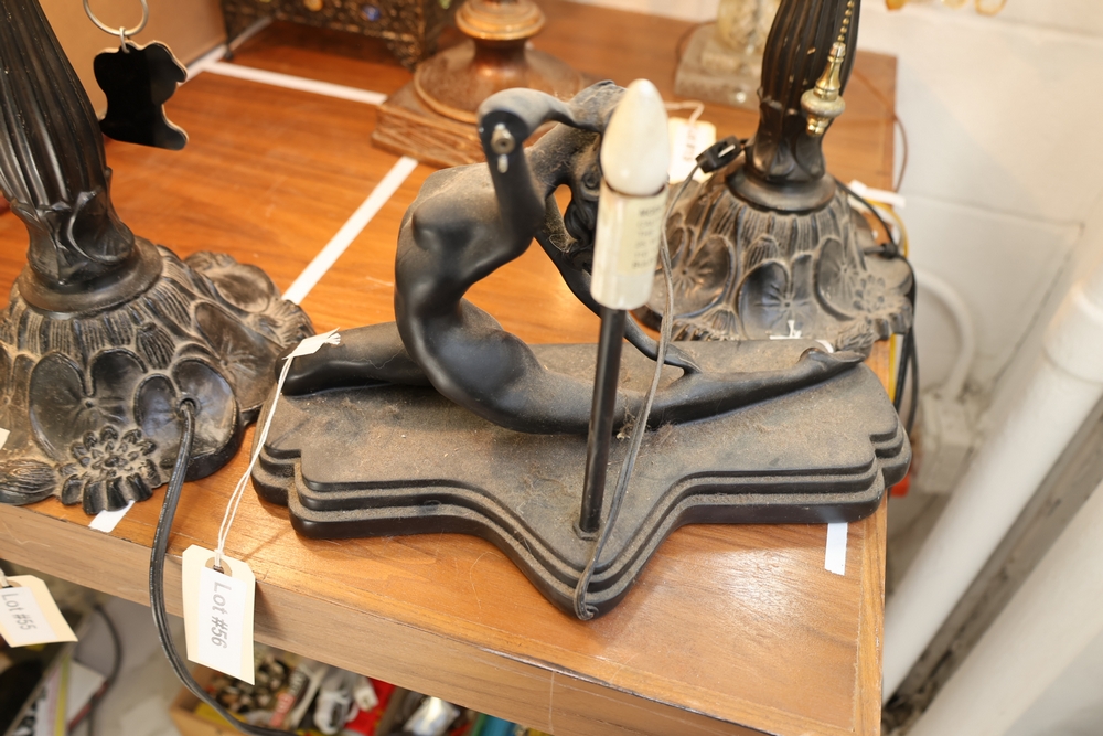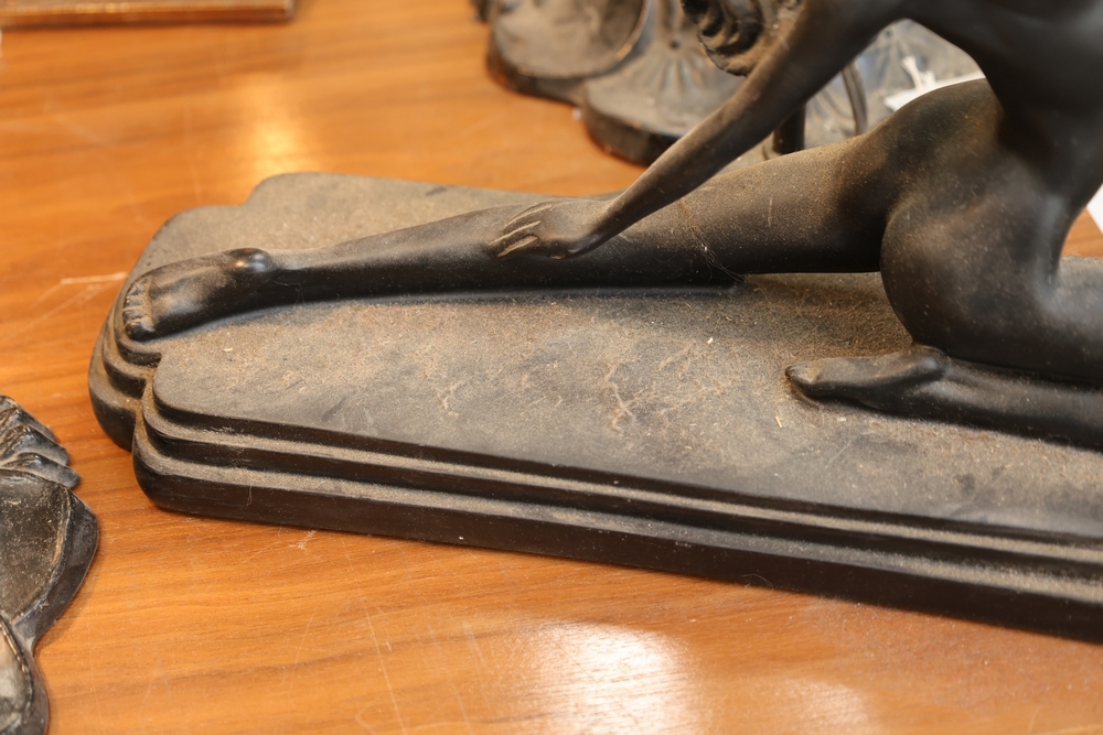 Art Deco style figural lamp base featuring a reclining nude female figure on stepped base. Dark metal or metal finish sculpture with stylized form typical of Art Deco design. Figure posed in stretching position with one arm raised behind the head and the other extended forward. Mounted lamp socket behind the figure. Shade not present.