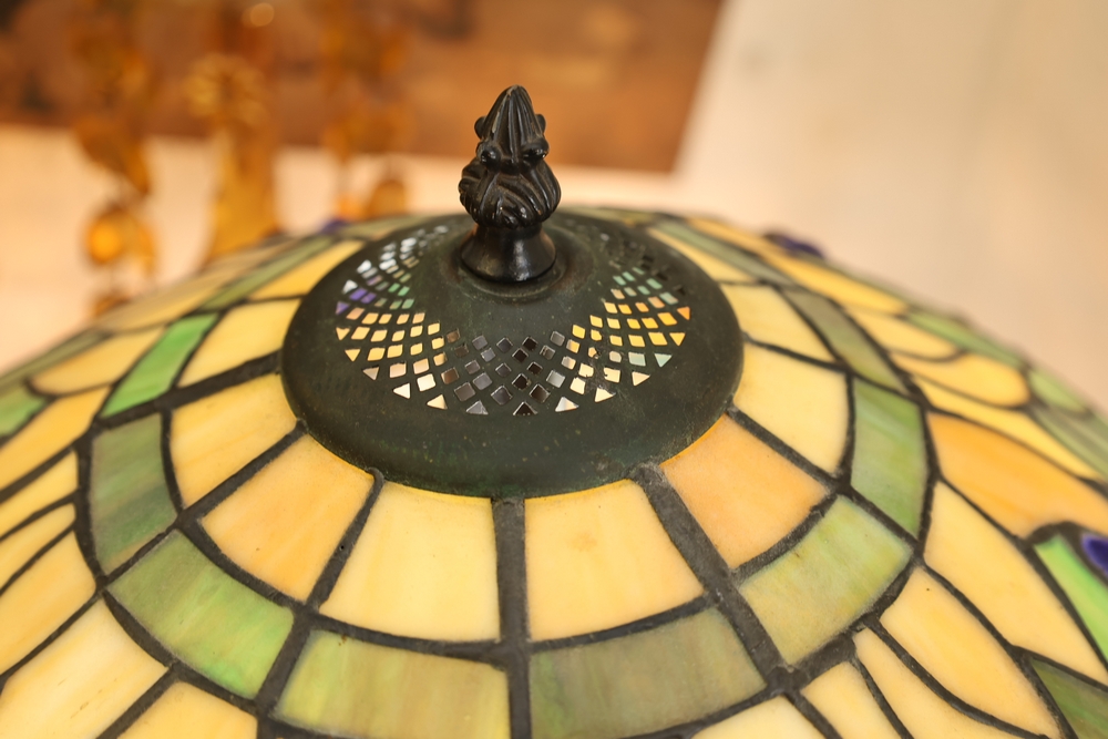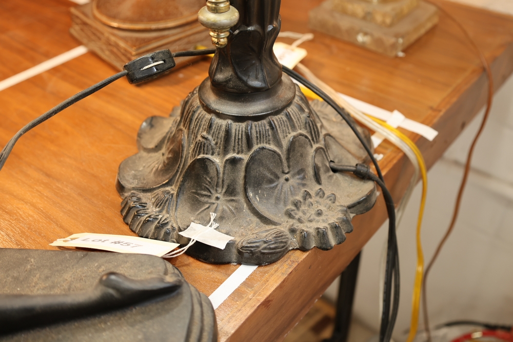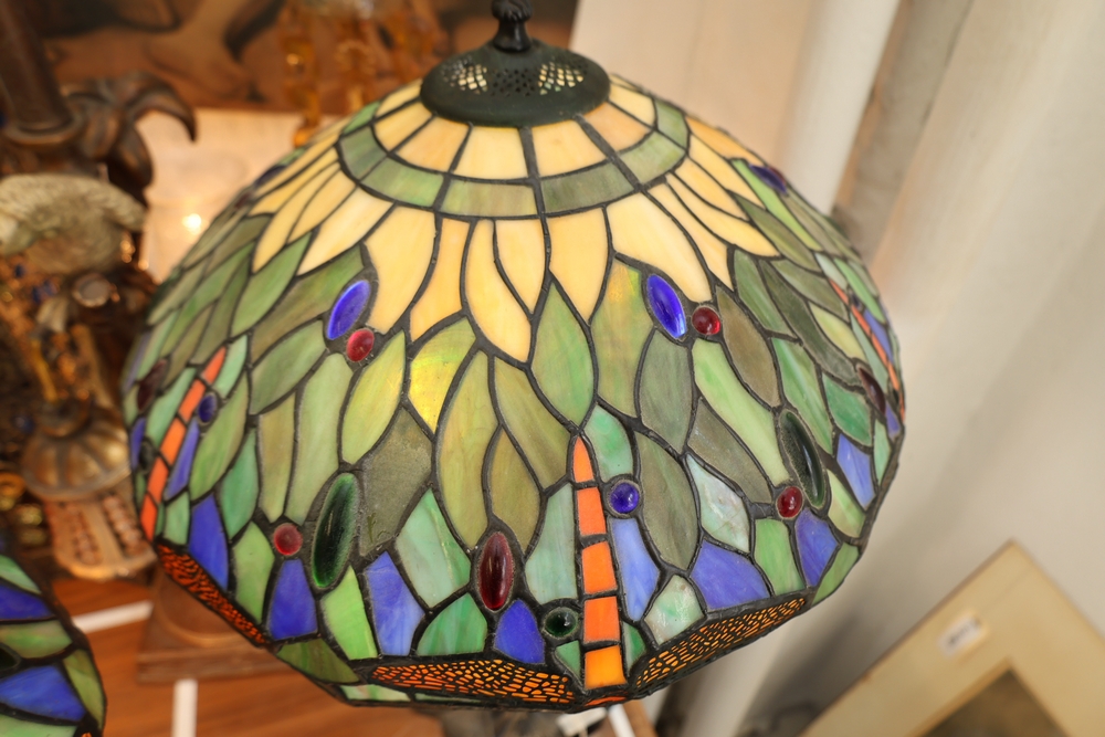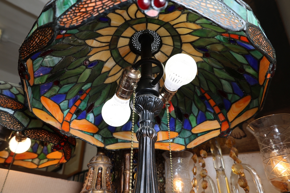 Tiffany style stained glass table lamp with domed leaded glass shade featuring dragonfly motif. Multicolor glass shade with green, blue, cream, and amber tones with raised jewel accents in red and green. Lower band decorated with dragonfly wings and textured amber glass panels. Shade mounted on dark metal lamp base with floral relief decoration and two pull chain light sockets. Shade measures approximately 18 inches across.
