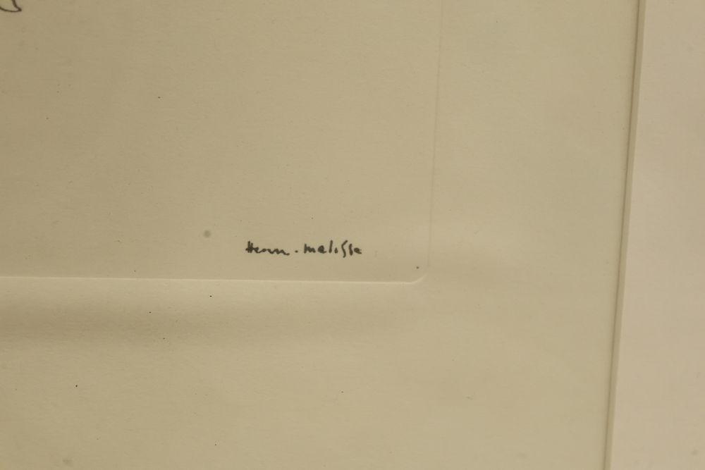 Framed Henri Matisse print depicting reclining female figure in minimalist line style. Signed in plate lower right “Henri Matisse.” Image shows a resting woman with head on arm rendered in simple continuous line. Matted and framed under glass in black frame. Approximately 19" x 22".