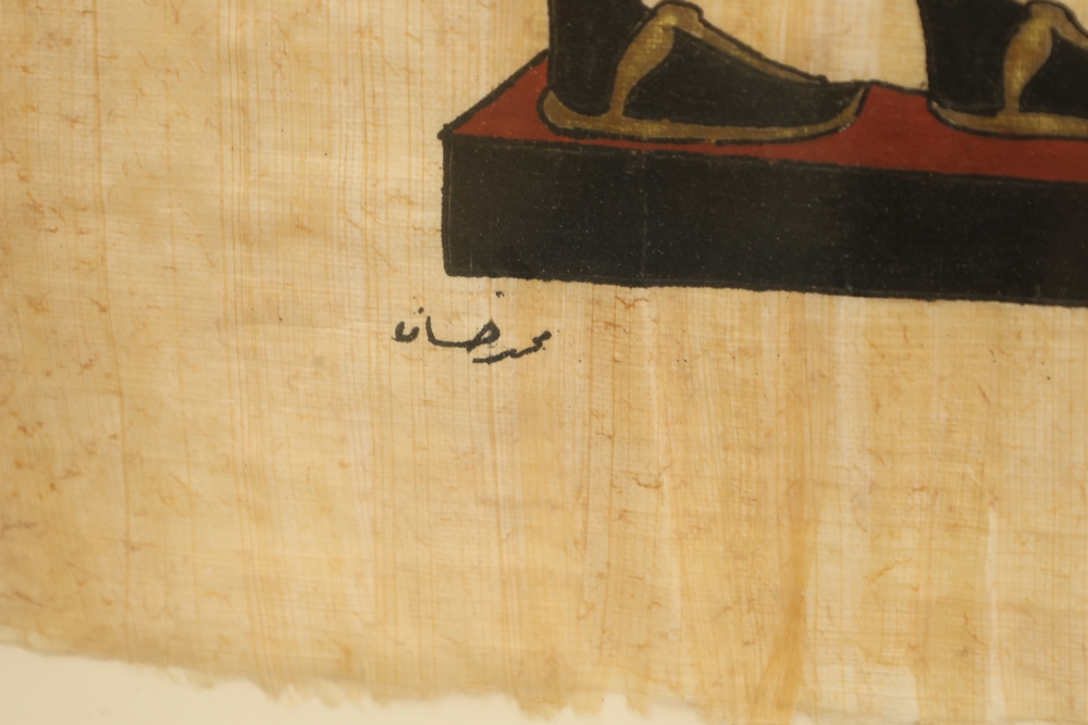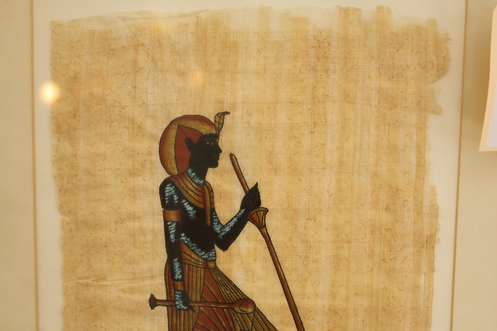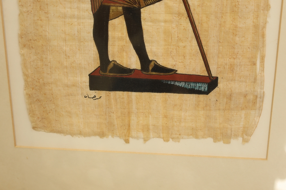 Framed Egyptian style papyrus artwork depicting standing figure in profile holding staff and scepter, with hieroglyph style signature below. Printed image on papyrus sheet with deckled edges, matted and framed under glass in wood frame. Frame measures approximately 21 x 17 inches.