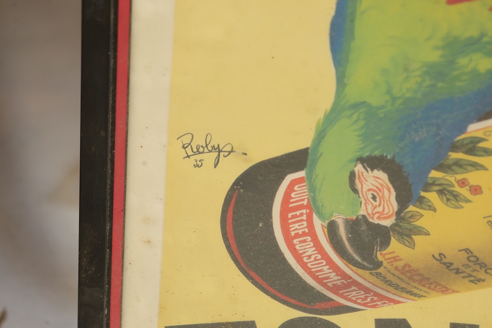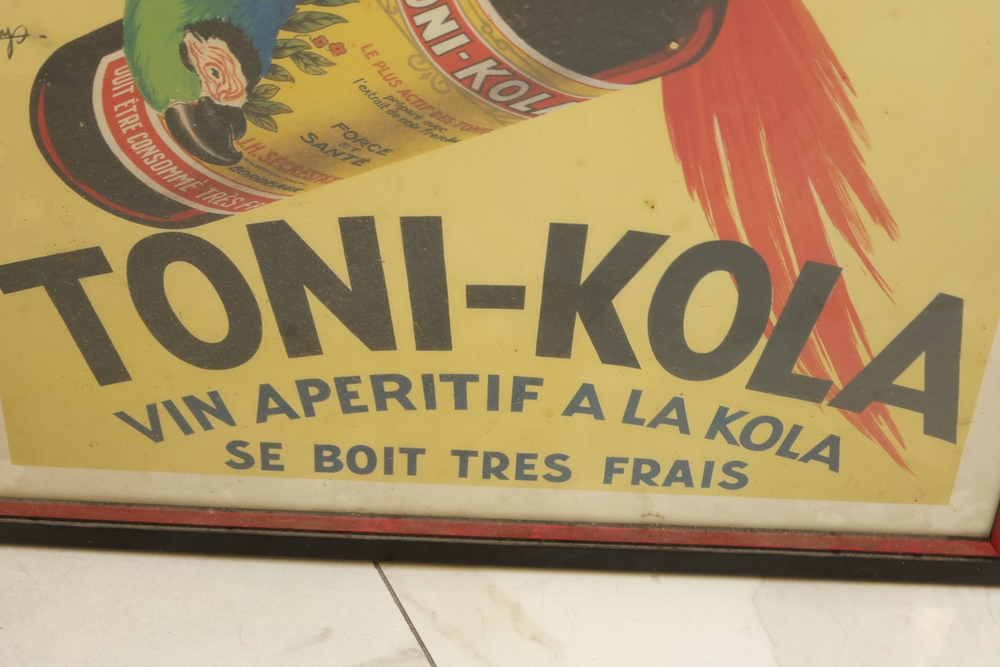 Framed Toni-Kola advertising print depicting two brightly colored parrots with wings spread above a bottle, with text “TONI-KOLA – Vin Aperitif a la Kola – Se Boit Tres Frais.” Image signed in plate “Robys 35.” Framed under glass with black frame and red accent border. Frame measures approximately 21 x 30 inches.