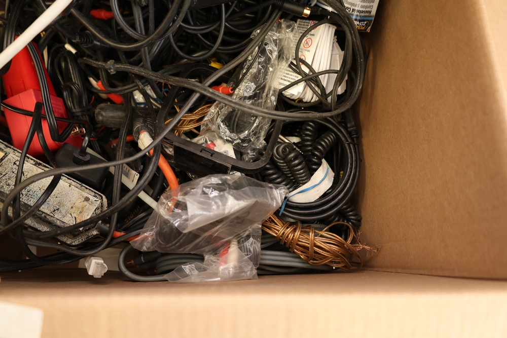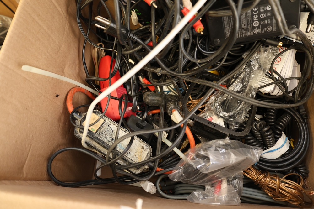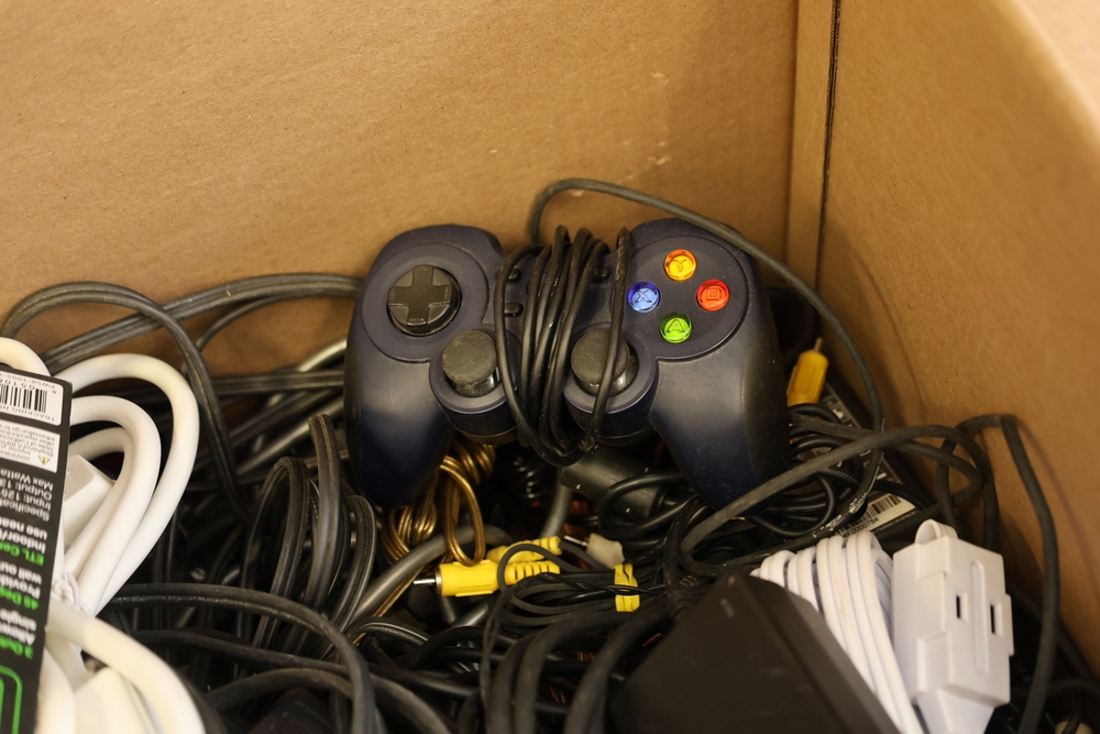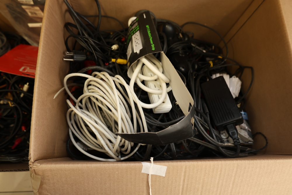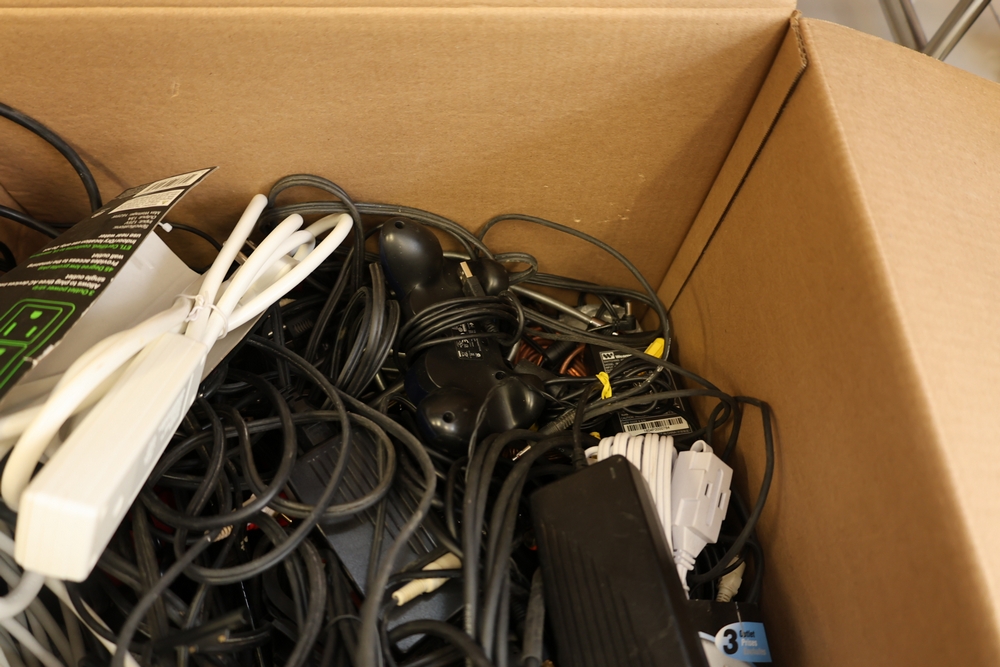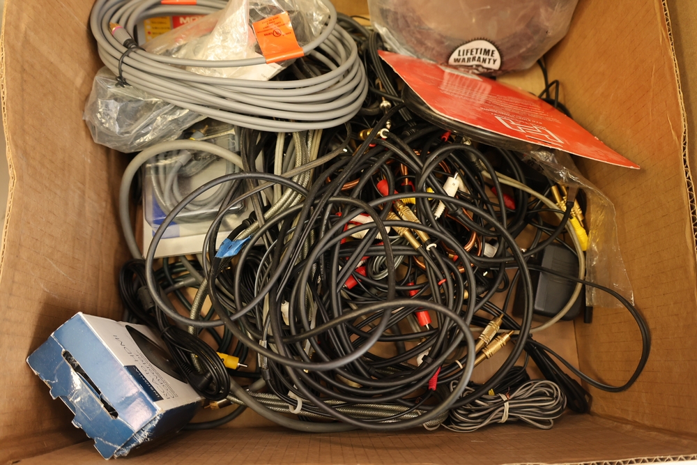 Two boxes of assorted electronic cables and accessories including audio/video cables with RCA connectors, HDMI cable in package, ethernet and data cables, power adapters, extension cords, power strip, and video game controller.